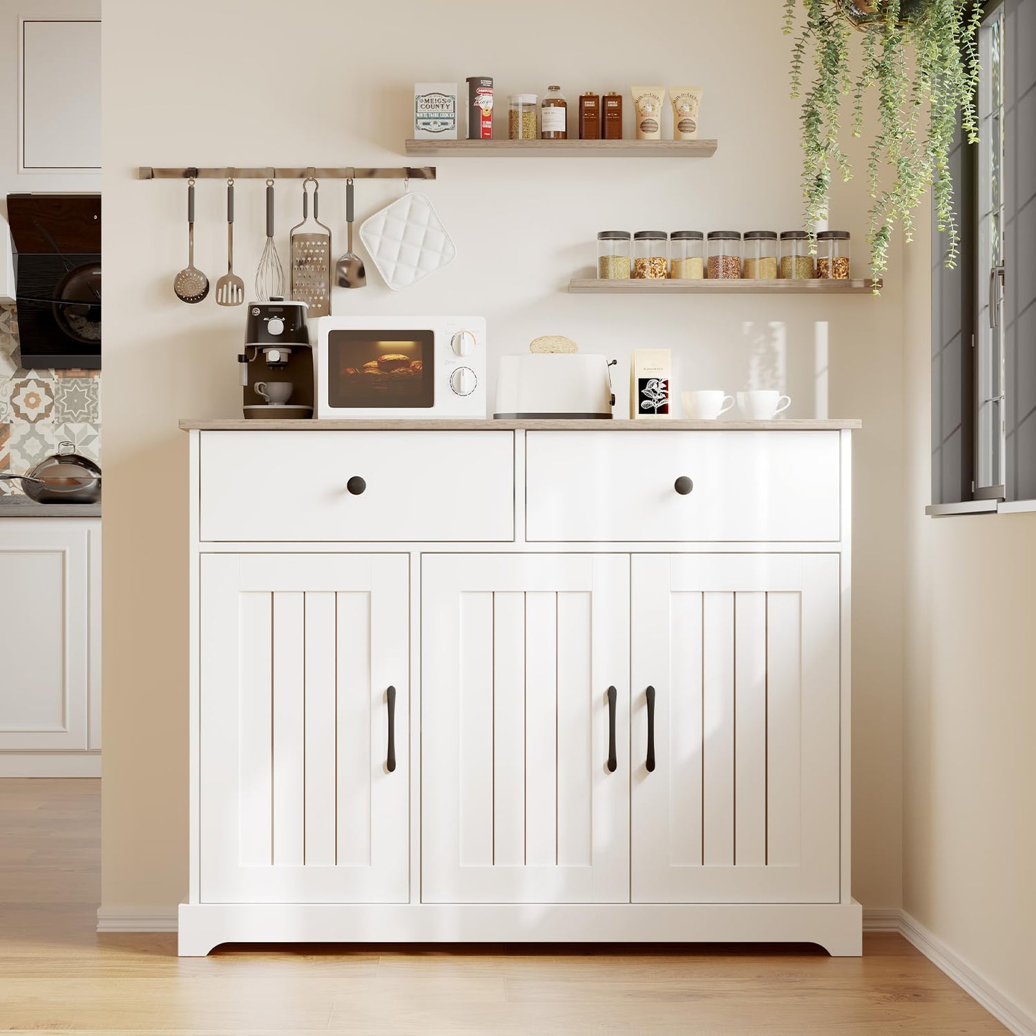 - Specifications: The buffet cabinet measures 42.5" x 14.9" x 33.46", the sideboard features a spacious 42.5-inch tabletop, two spacious drawers and three cabinet doors. The spacious tabletop can accommodate kitchen appliances, such as a coffee maker and microwave, and can also be used to serve beverages or display decorative items, and the drawers provide additional space for storing smaller items.