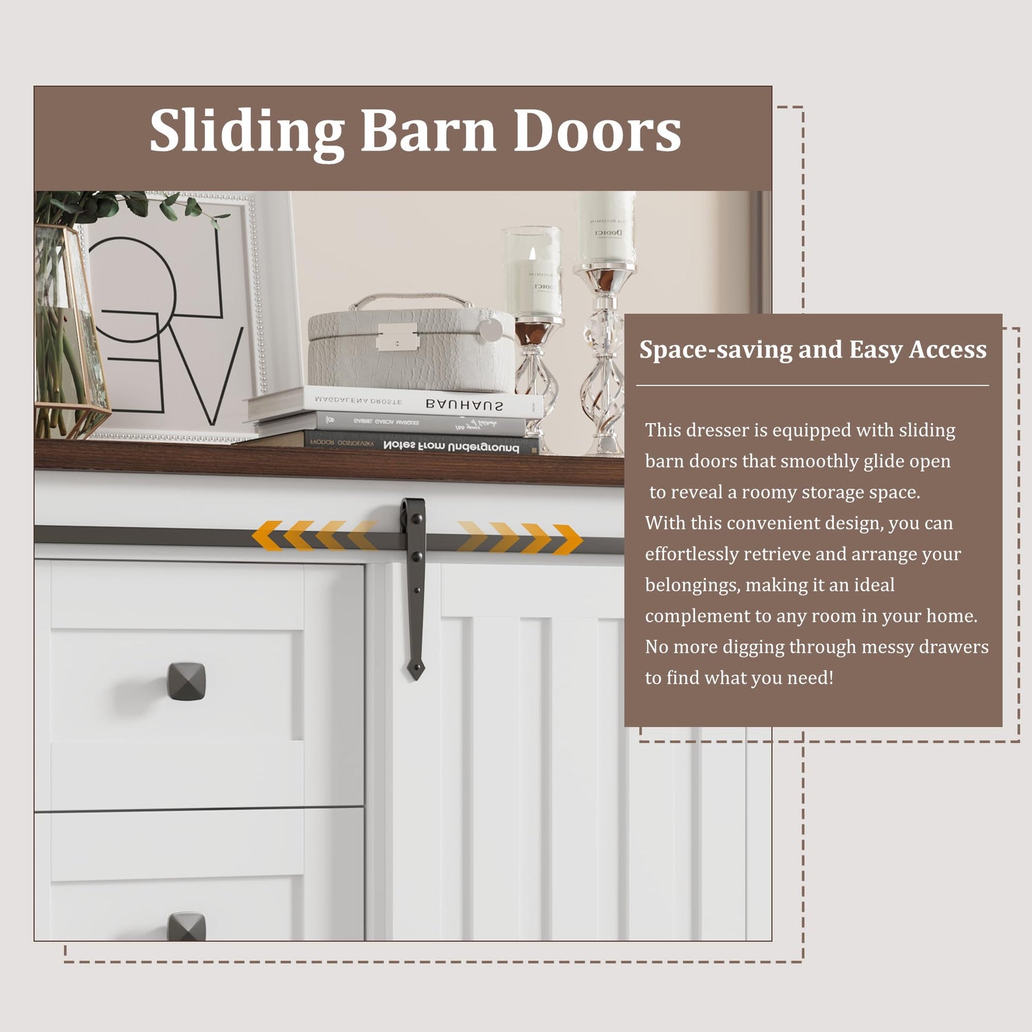 - 【SLIDING BARN DOOR】The farmhouse-inspired sliding barn door glides smoothly along a metal track, revealing adjustable shelving for flexible storage. With a 3-level adjustable and removable shelf, it easily accommodates items of various sizes. The smooth-glide track ensures effortless operation, making it easy to use for all ages. Conceal or showcase your items with ease—this dresser with barn door keeps your space tidy and stylish.