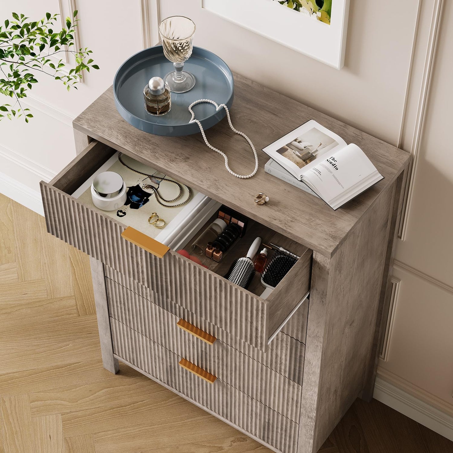 - Modern Fluted Design with Farmhouse Charm: The elegant fluted drawer fronts combined with a warm farmhouse wood grain finish create a timeless look. This wooden dresser enhances any decor style, functioning well as a bedroom dresser, entryway accent cabinet, or living room storage piece.