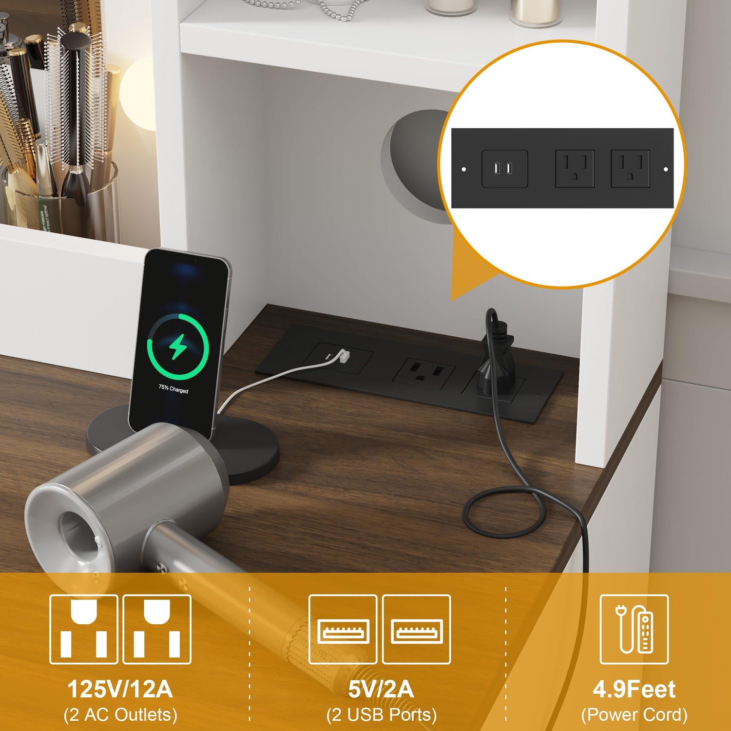 - USB Ports & Outlets: There is a charging board with 2 standard plug sockets and 2 USB ports on the vanity set for your devices and beauty tools.Ideal for any bedroom or dressing area, it’s also a thoughtful gift for any occasion. Its chic design adds a touch of glamour to your bedroom, dressing room, or studio, making it a perfect gift for loved ones.