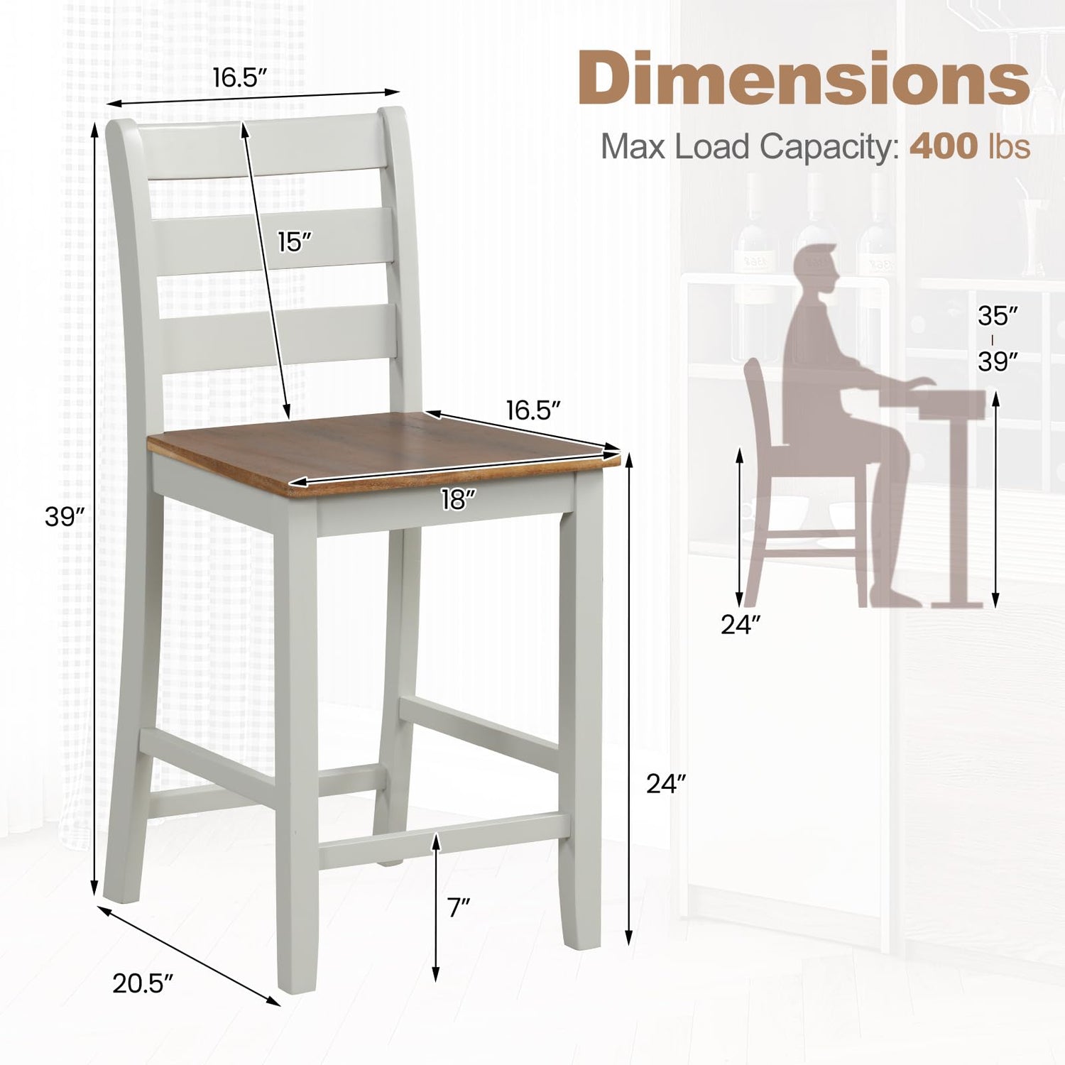 - [Versatile Addition]: With dimensions of 18"L x 20.5"W x 39"H, these wood bar stools set of 2 are ideal for most counter heights from 35" to 39". They are not only great for the kitchen or dining room but also fit perfectly in pub, cafe or bistros.