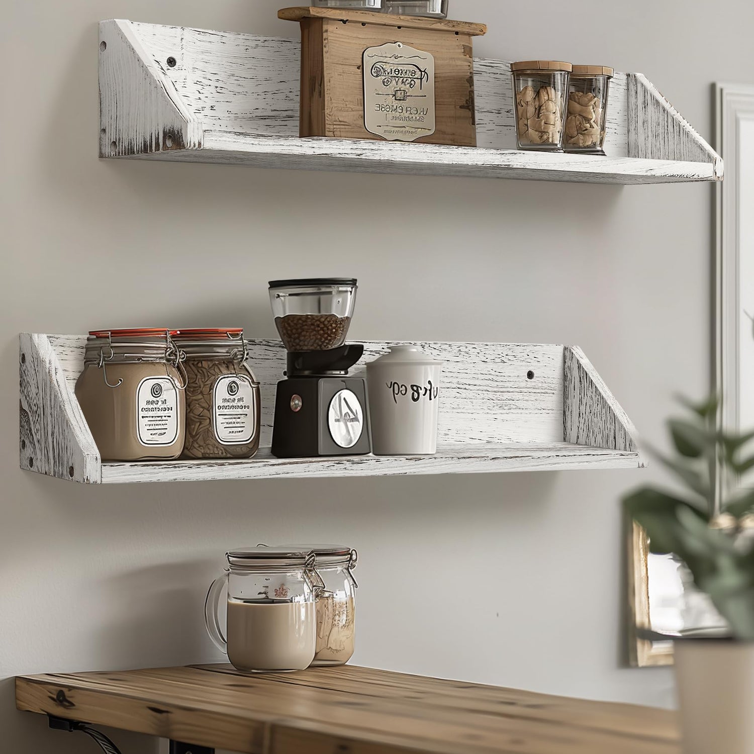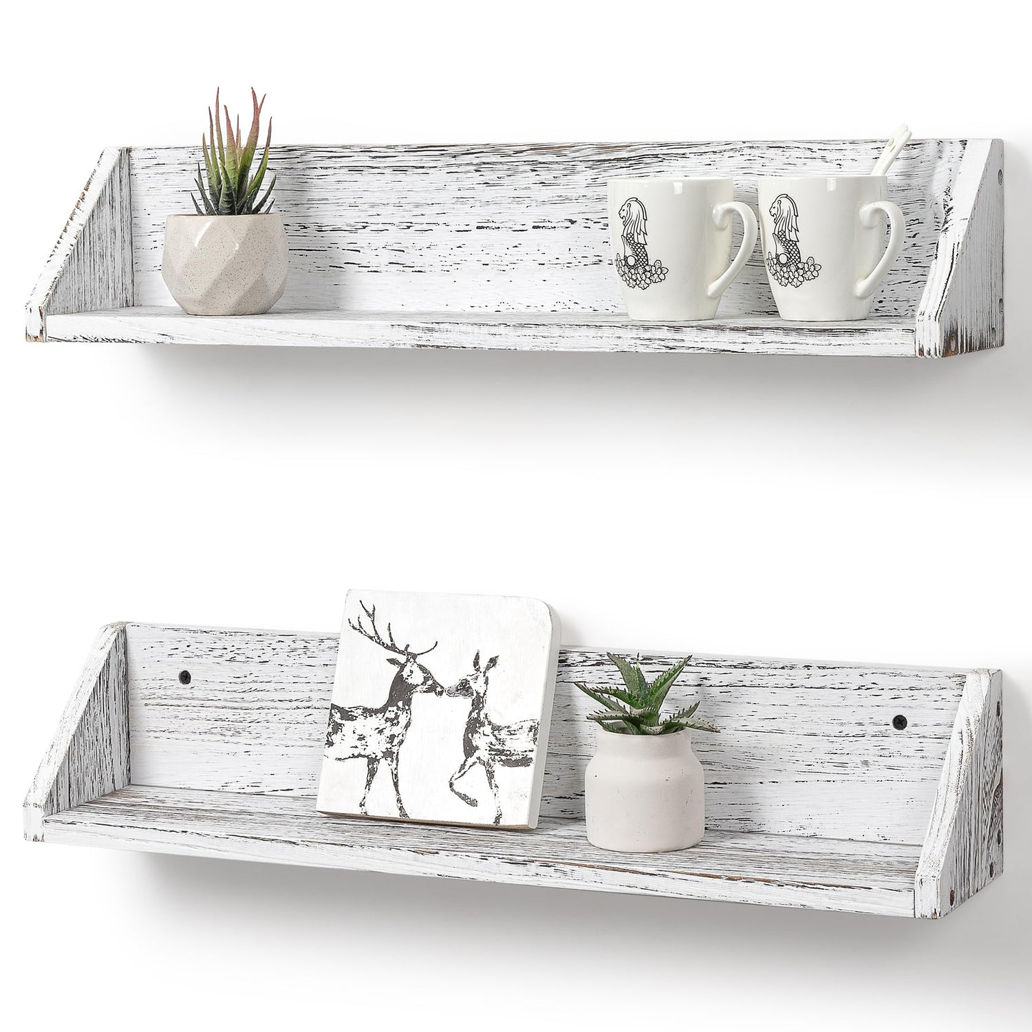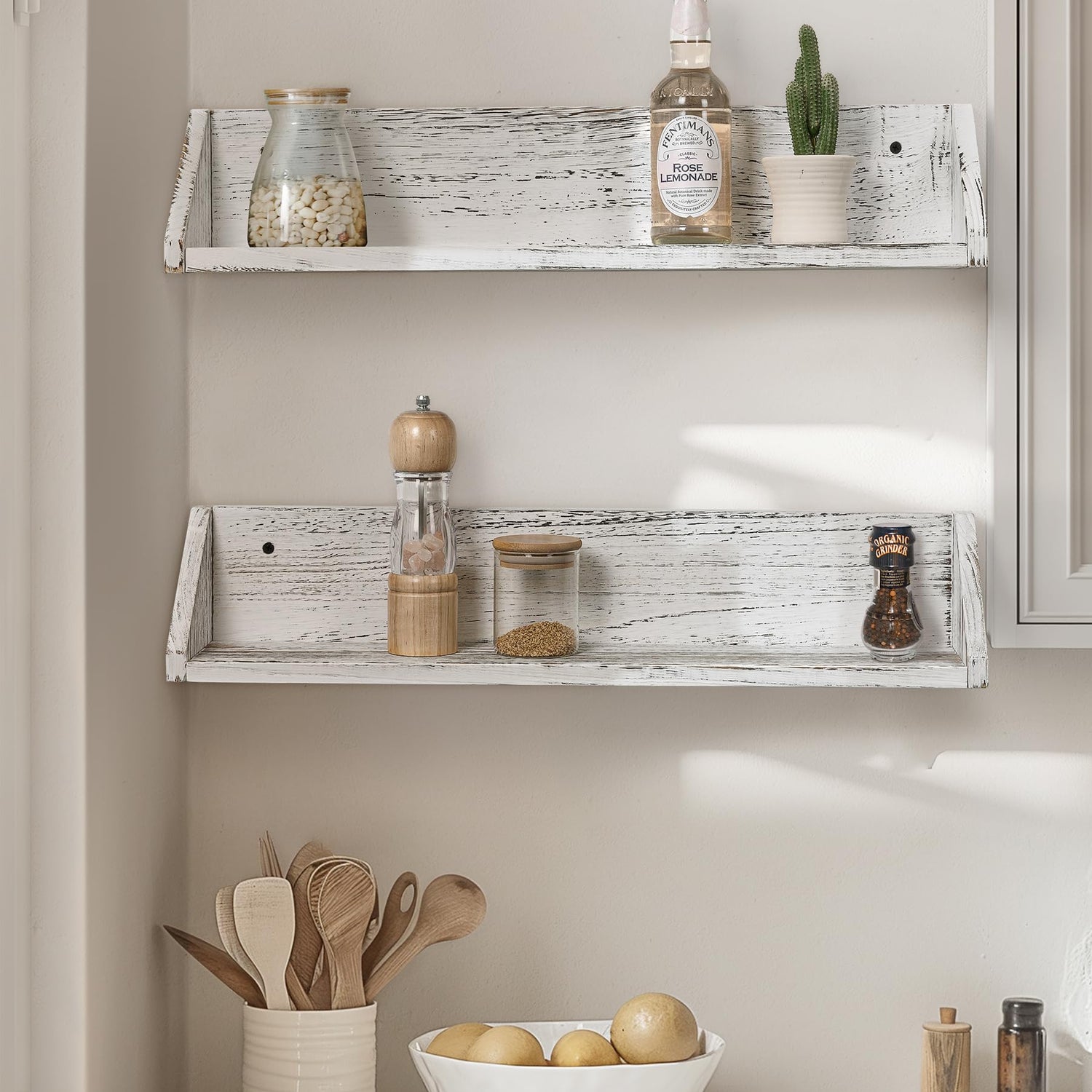 Gronda Kitchen Floating Shelves for Wall, Shabby Chic Wood Farmhouse Wall Mounted Shelf 2-Pack 24 Inches Whitewashed Shelves Hanging for Wall