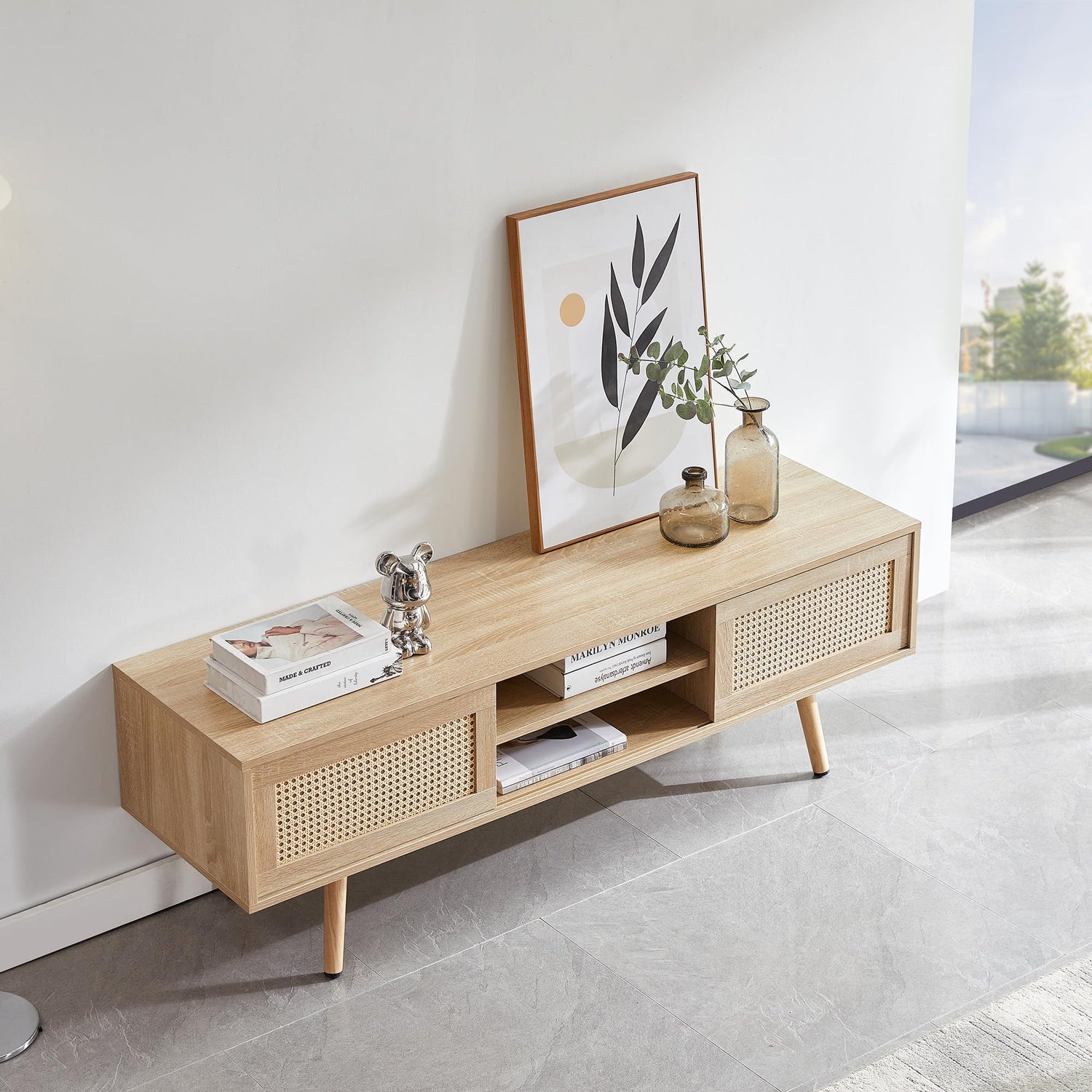 GSSDEE Boho TV Stand for 65+ Inch TV, Farmhouse Wood Television Stand with Natural Rattan Sliding Doors, Media Console Center Natural Style (Natural Oak, TV Stand 55.12" L x 15.75" W x 18.31" H)