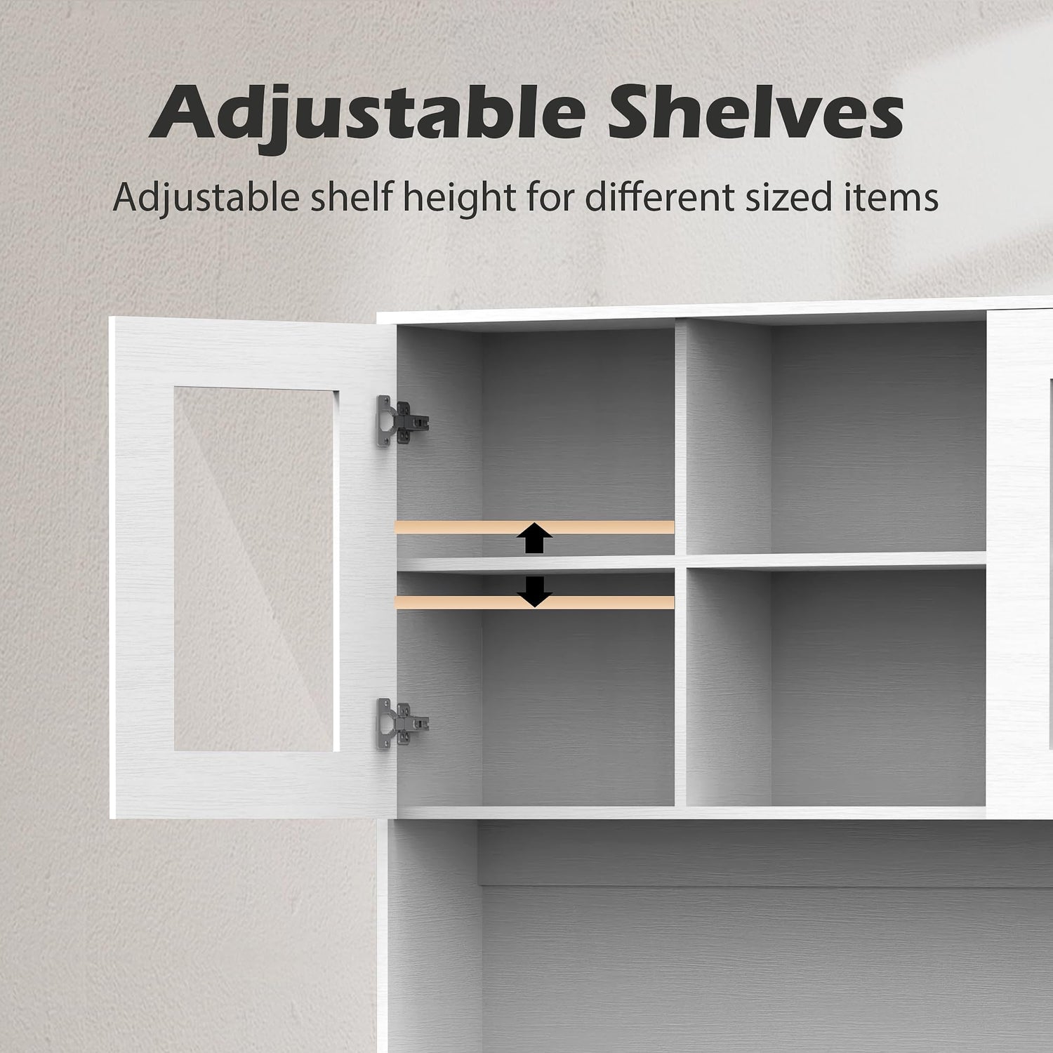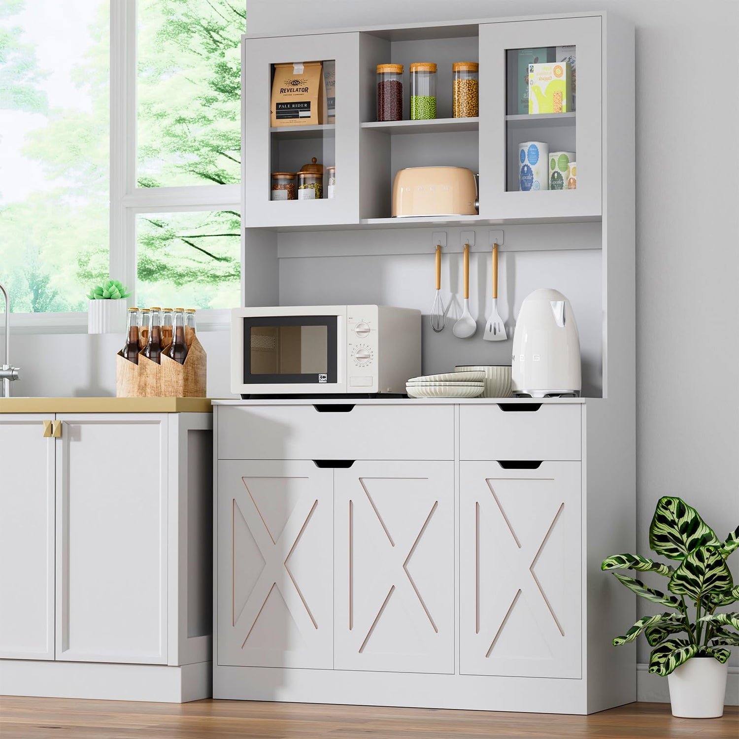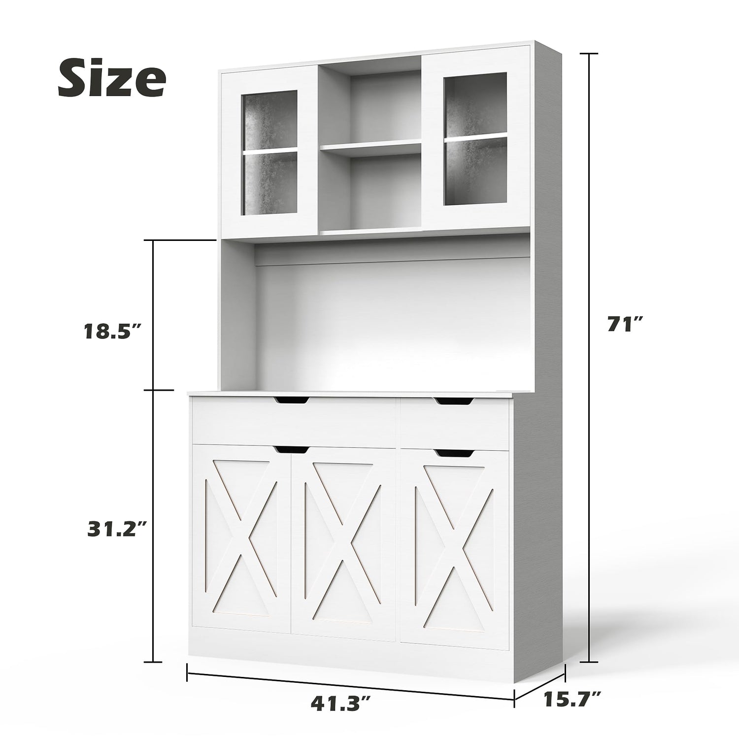 GTFURNI 71" Tall Kitchen Pantry Storage Cabinet Large Farmhouse Hutch Cabinet with Microwave Stand, Charging Station, Adjustable Shelves, Countertop for Dining Room, Living Room, White