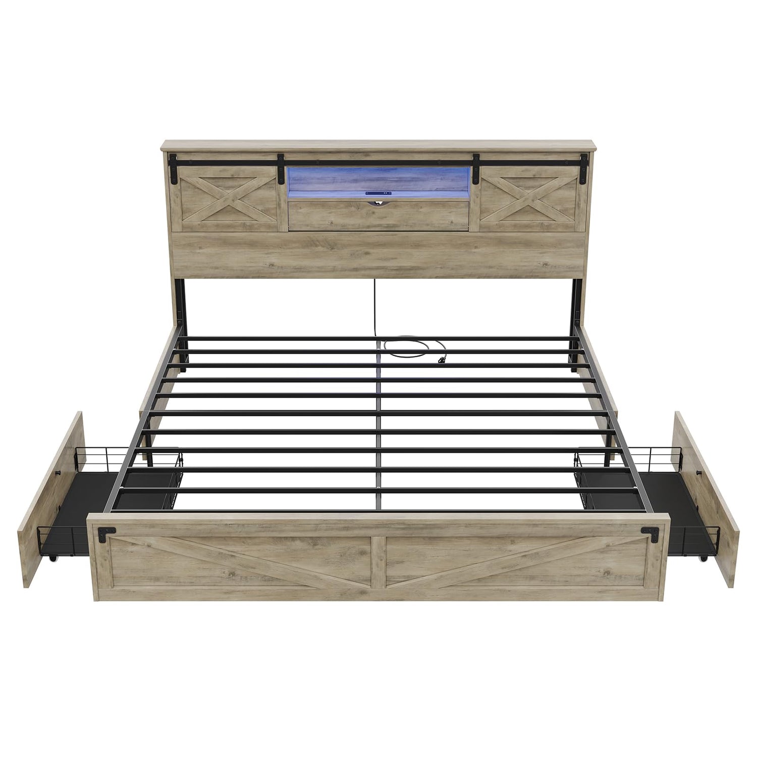 Hasuit Rustic Oak Farmhouse King Bed Frame with LED Lights, Charging Station, and Storage Drawers