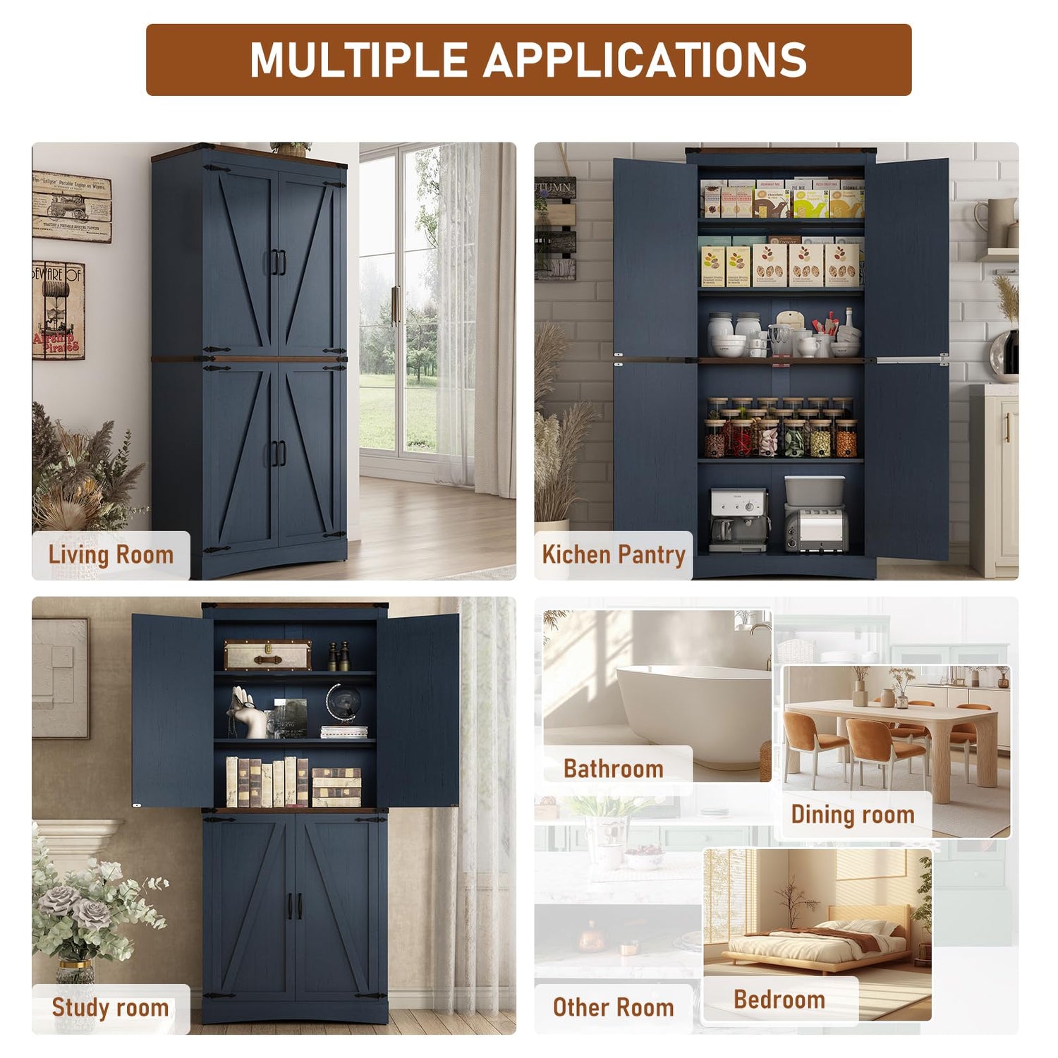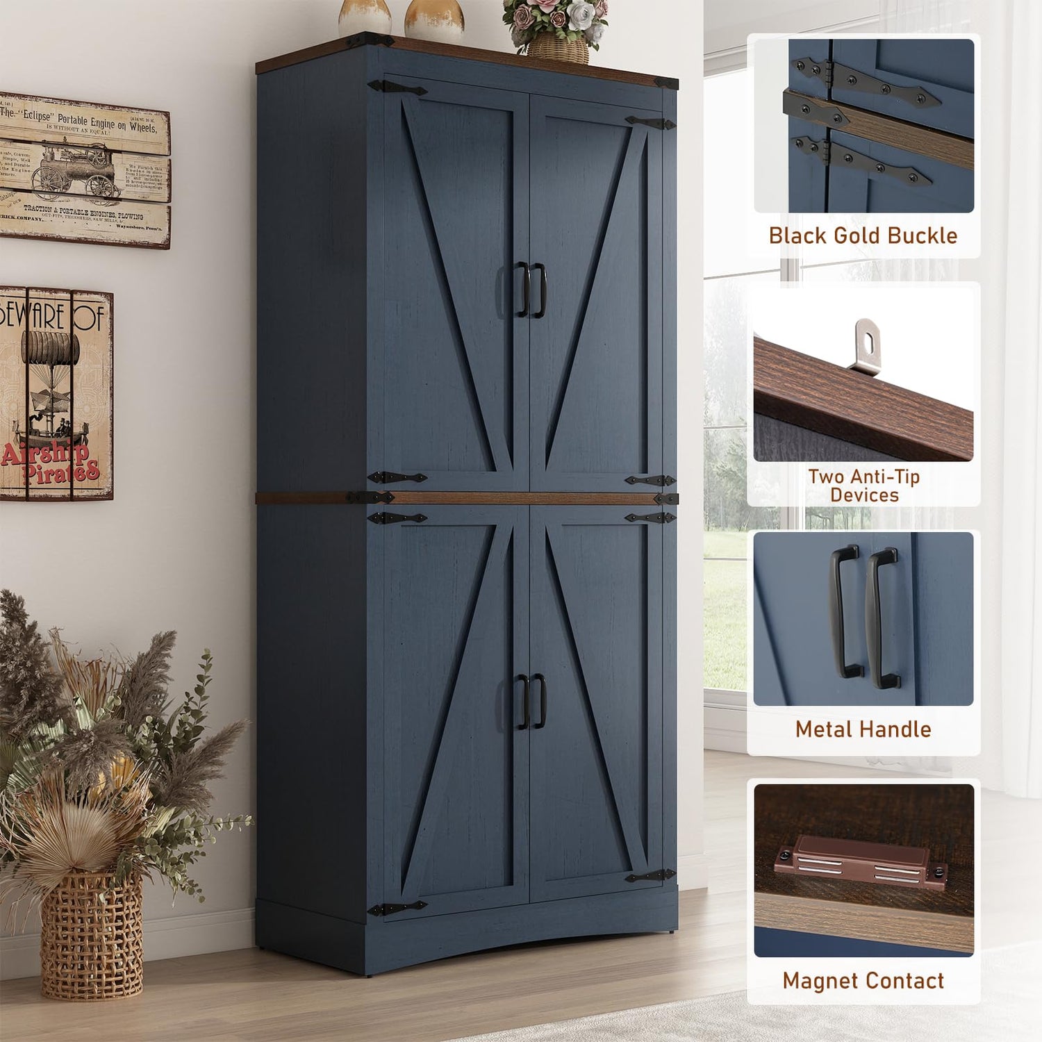 Hlivelood 71" Tall Kitchen Pantry,Farmhouse Storage Cabinet with Adjustable Shelves,Load-Bearing Steel Pipe,Farmhouse Pantry Cabinet with 4 Barn Doors,for Kitchen,Dining Room,Living Room(Blue)