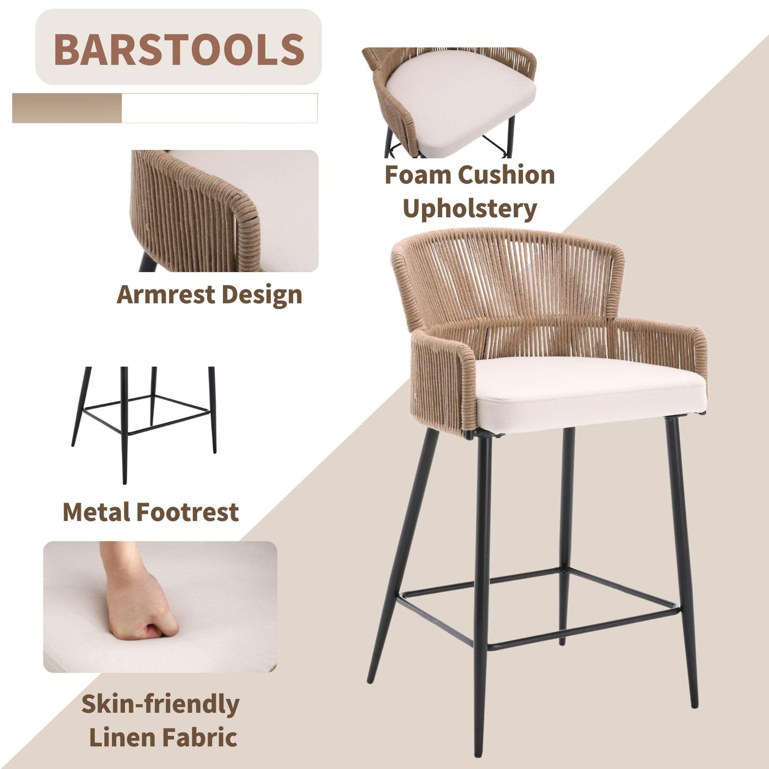 - FEATURE: Our upholstered bar stool adopts farmhouse style, and with curved back and short arms along the side are crafted from woven rope. The black metal frame provides a solid and stable structure for the kitchen chairs