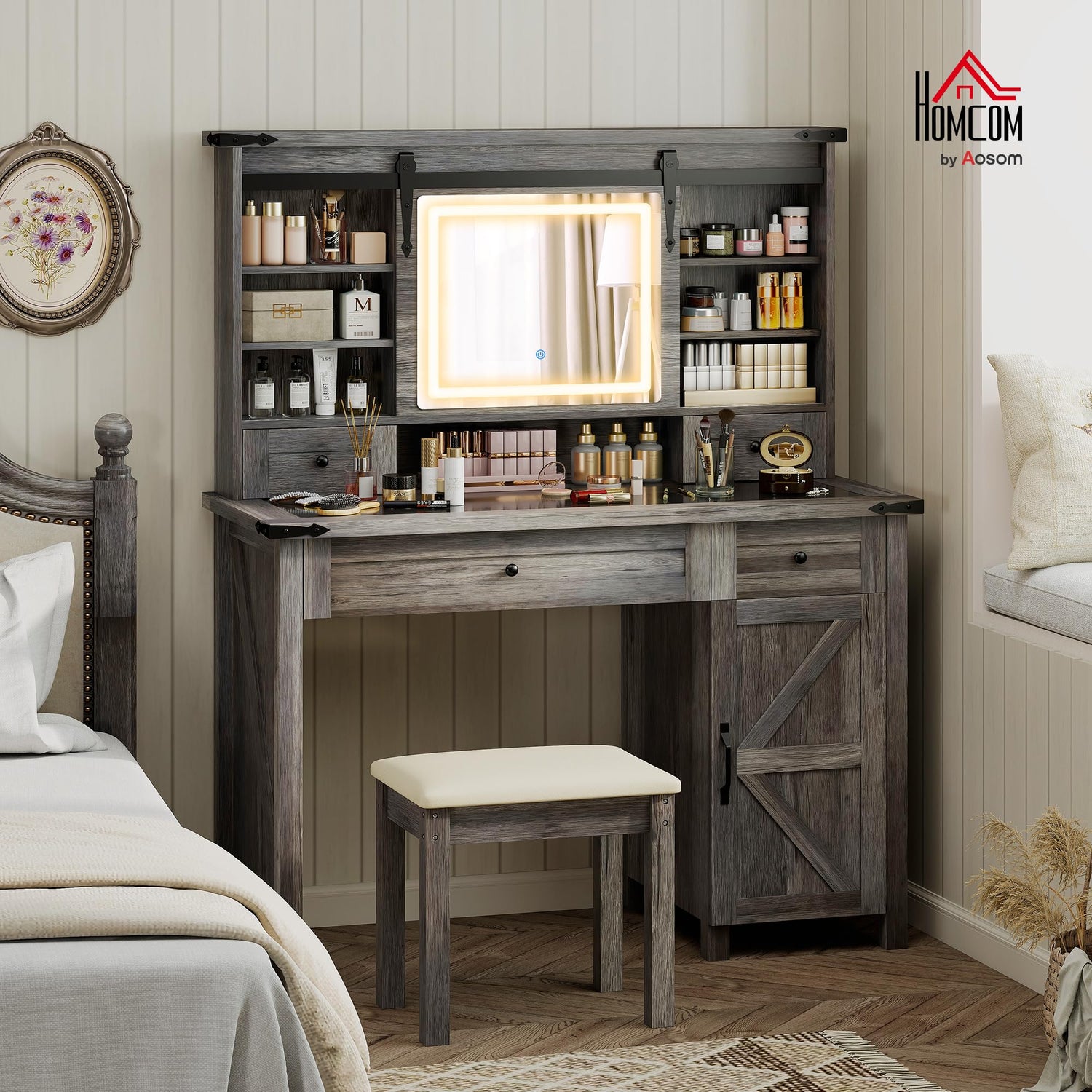 HOMCOM Farmhouse Vanity Desk with Mirror, LED Lights Makeup Vanity Table with 42 Inch Glass Tabletop, Cushioned Stool, Drawers & Shelves & Cabinet, Rustic Dressing Table Set for Bedroom, Gray