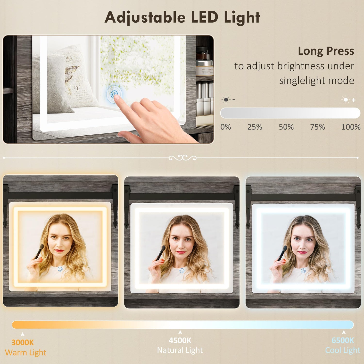 • Light Up Your Beauty Routine: Glow like never before with this vanity desk featuring a tri-color LED mirror with warm, natural, and cool light settings. The mirror slides to reveal hidden shelves to make storing your makeup magical and effortless