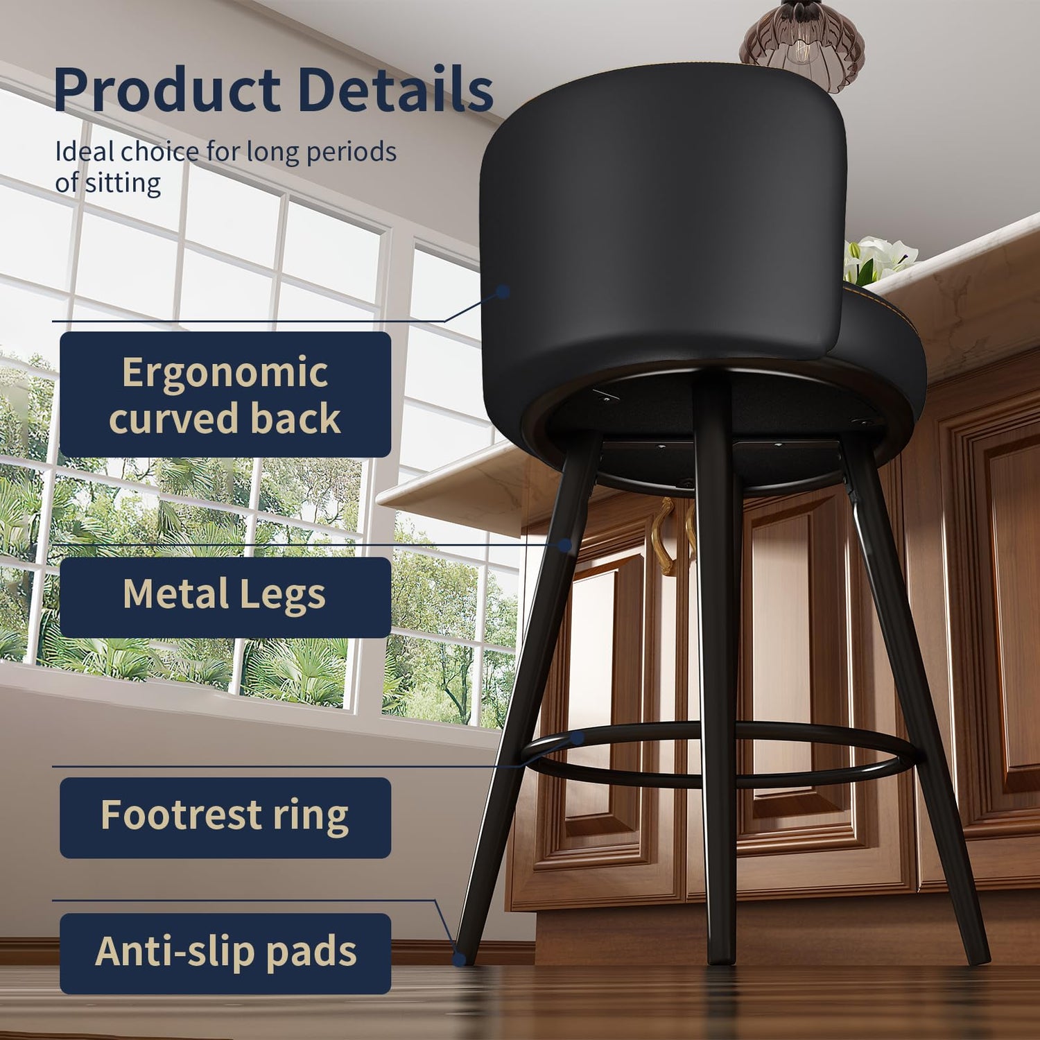 HONIFUR Bar Stools Set of 2, 27 Inch Barstools with Sturdy Legs, Leather Farmhouse Counter Height Bar Stool for Kitchen, Dining, Bar (Swivel, Black, Leather)