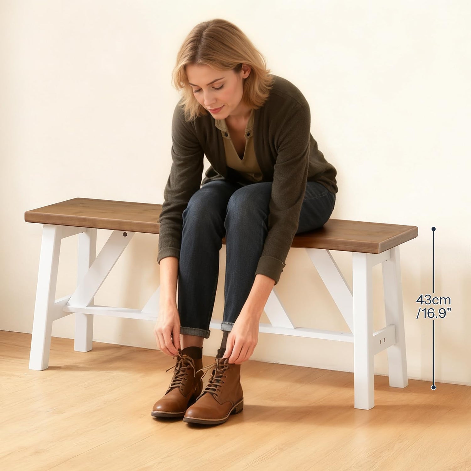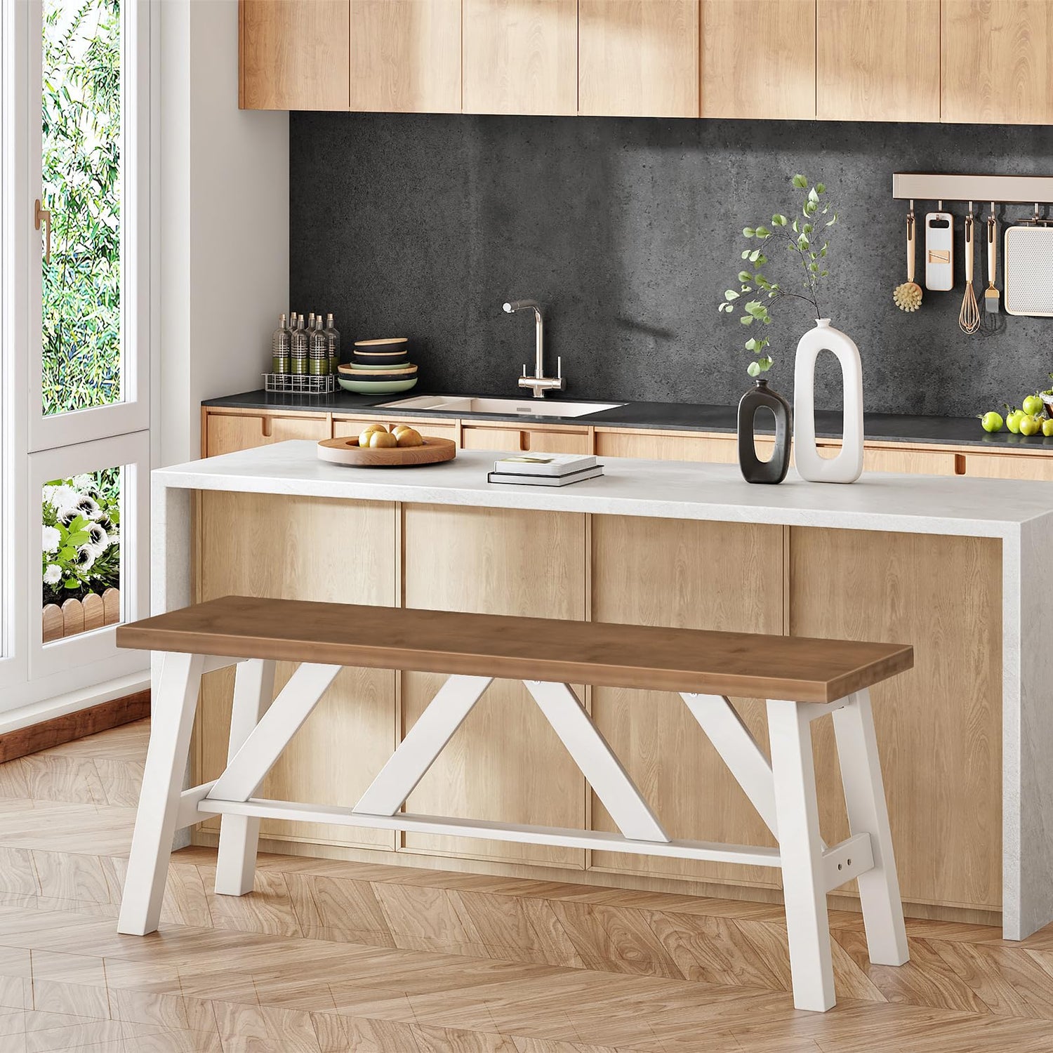 - Farmhouse Dining Bench: The warm walnut finish paired with white brings rustic character into your home. This bamboo kitchen table bench features clean, modern lines that fit into your dining room, kitchen, or entryway, creating a cozy and inviting atmosphere