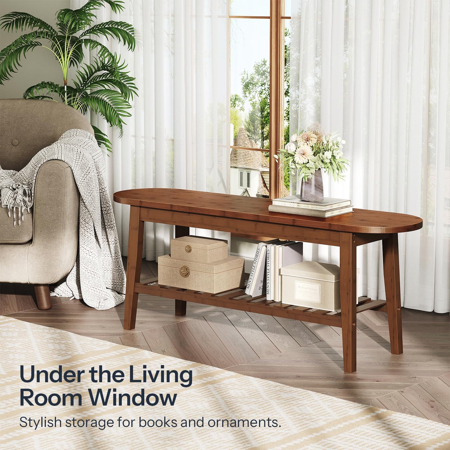 HOOBRO Dining Bench, 2-Tier Bamboo Farmhouse Entryway Bench, Indoor Storage Wooden Bench for Living Room, Dining Room, Hallway, Bedroom, Entryway, Bathroom, Brown BR06CD01
