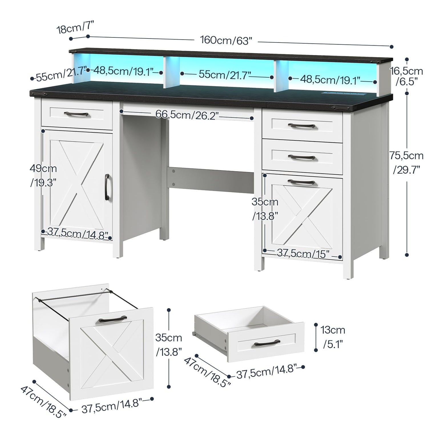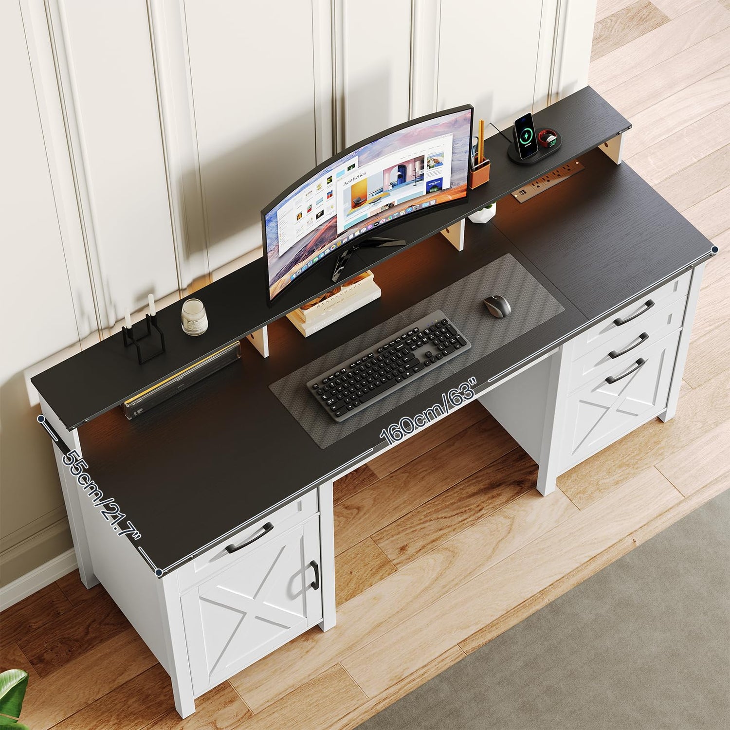 HOOBRO Farmhouse Executive Desk with Drawers, 63" Large Farmhouse Desk with Power Outlet & LED Light, Office Desk with Drawers, Computer Desk with File Cabinet, Writing Desk with Monitor Stand, White
