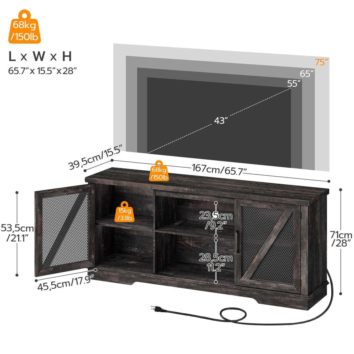 - Farmhouse TV Stand with Large Storage: The media entertainment center is 65.7"L x 15.5"W x 28"H and can hold TVs up to 75". Various storage options, including side shelves with 3 adjustable heights, can store your game consoles, speakers, etc. tidily, creating an ideal media center
