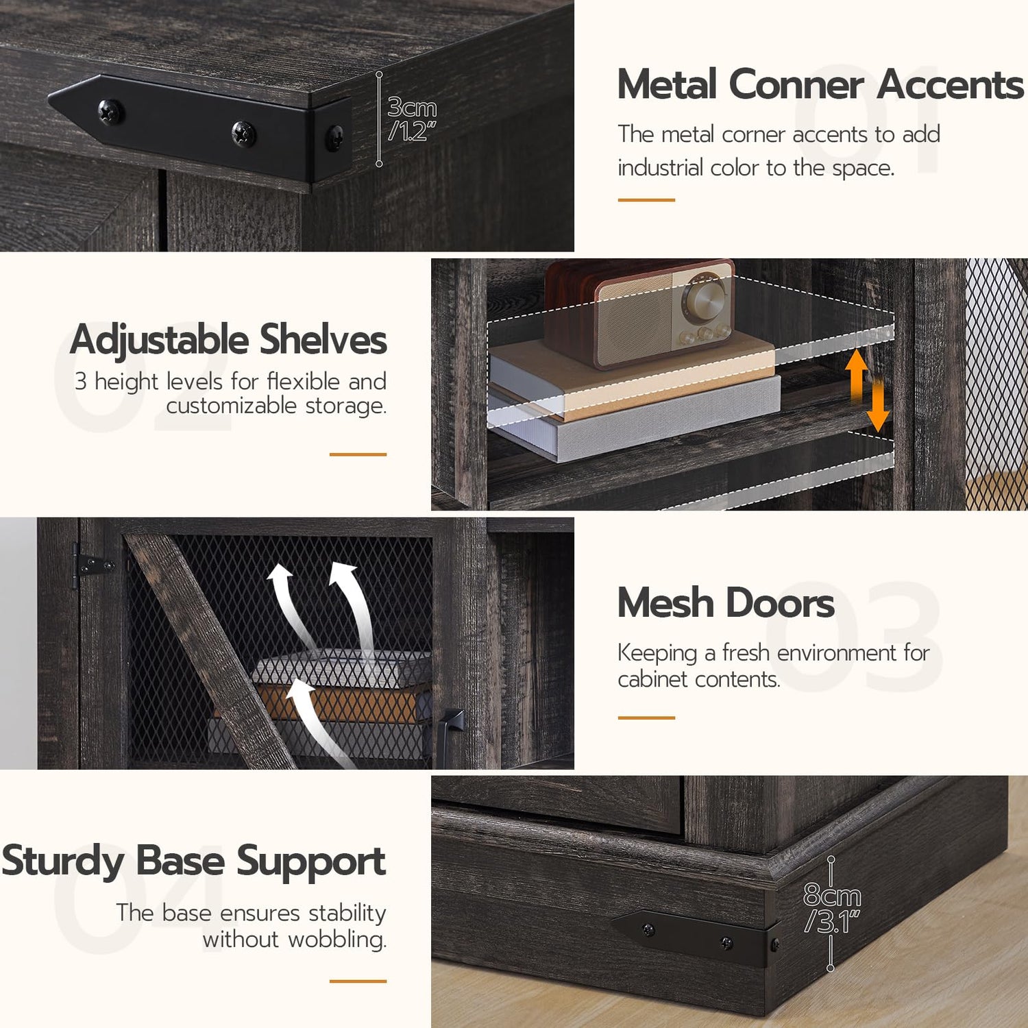 - Quality TV Console Table: The TV stand for living room is carefully crafted with premium particleboard and metal, firm and durable. The thick top can easily support up to 150 lb, and 3 adjustable shelves support up to 33 lbs each. The unique mesh door design achieves the dual functions of ventilation and privacy, while legs with nails enhance overall stability
