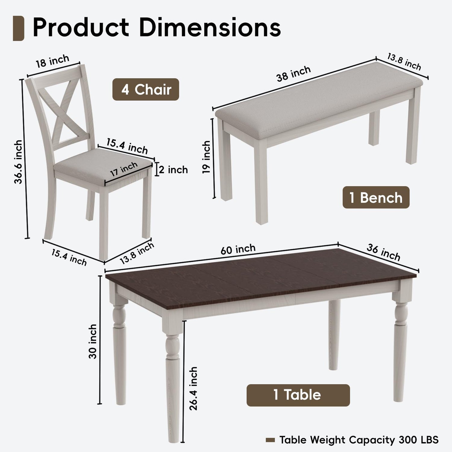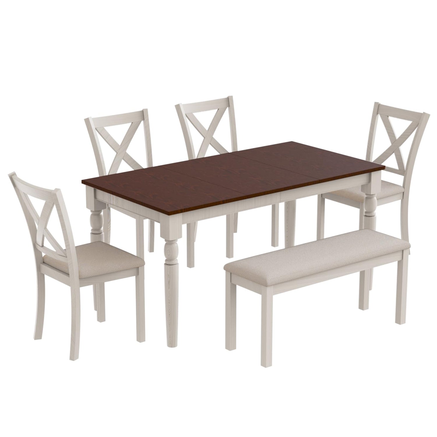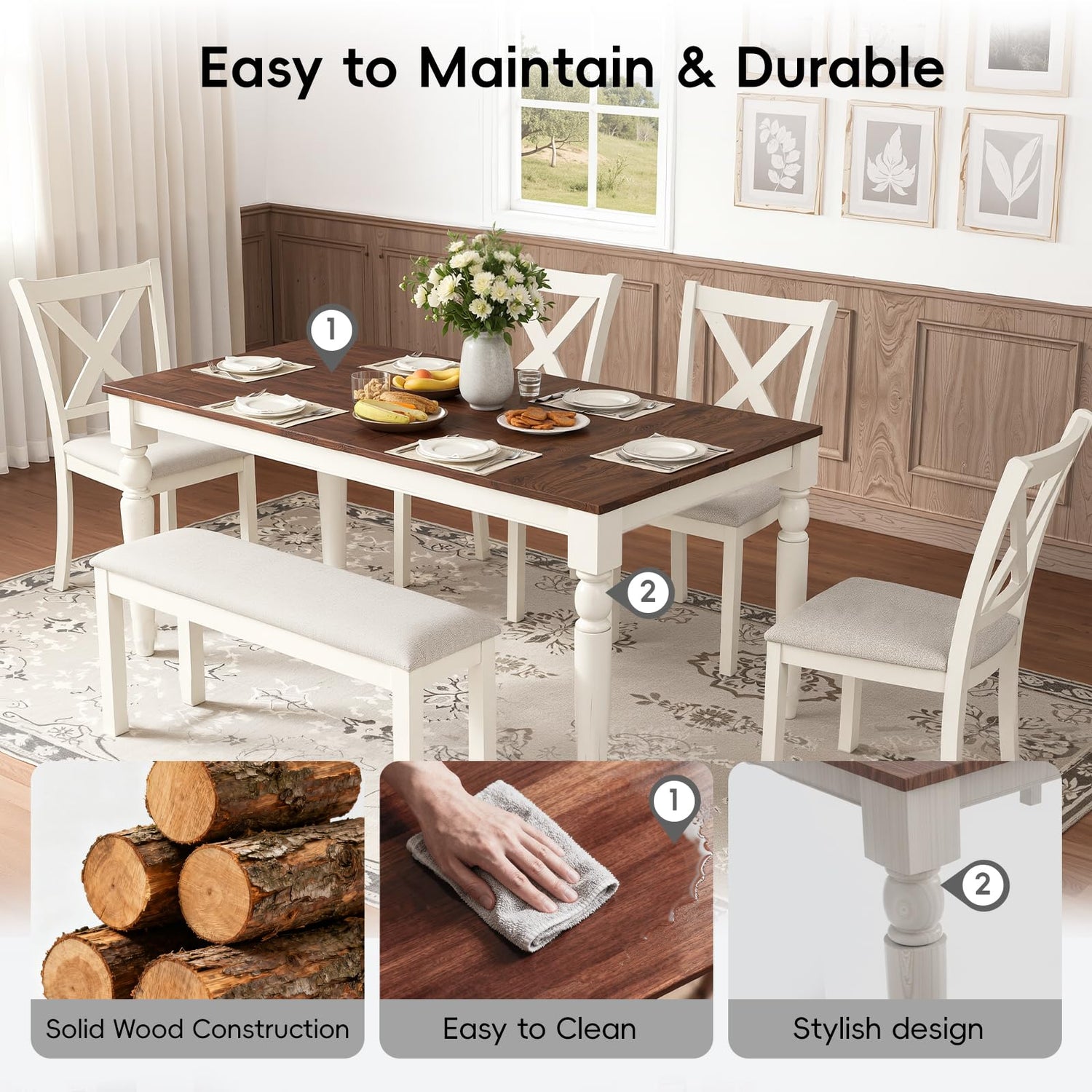 HOPETANA 6-Piece Dining Room Set - Rectangular Solid Elm Wood Table with Bench & Upholstered Chairs, White/Brown