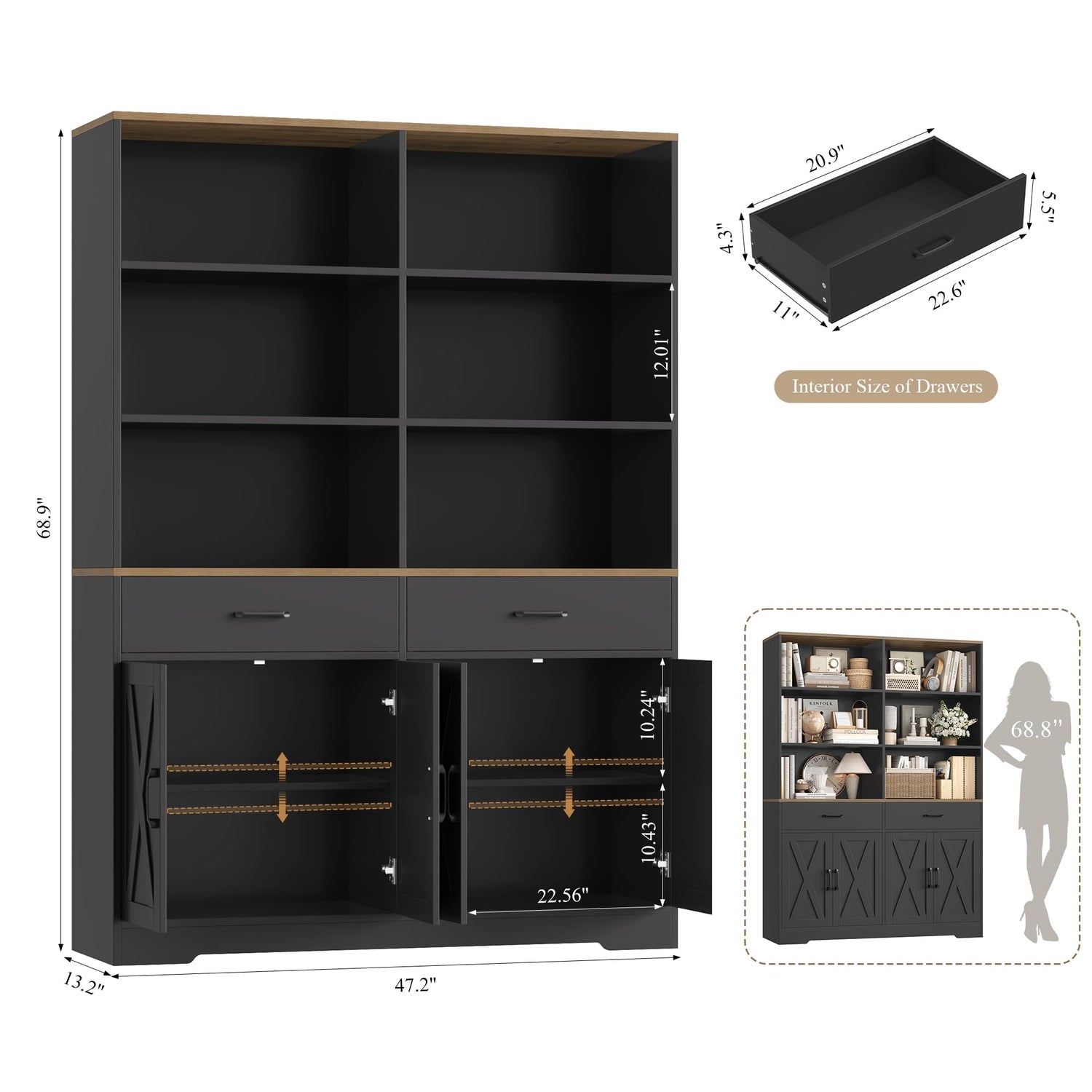 HOSTACK 69" Tall Book Shelf and Bookcase, Wooden Bookcase with Doors, Large Bookshelf with Drawers, Farmhouse Book Case with Storage Cabinet, Bookshelves with Display Shelves for Home Office, Black