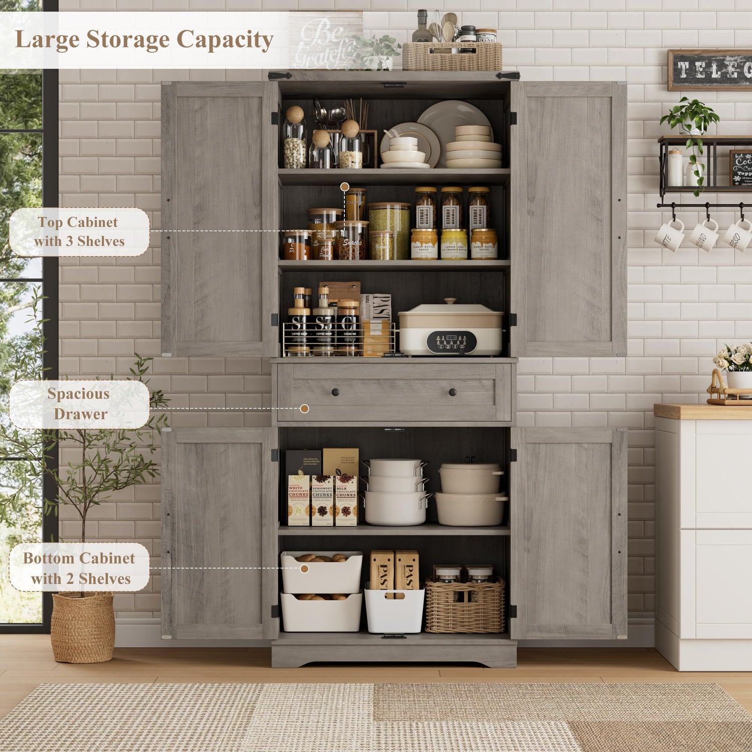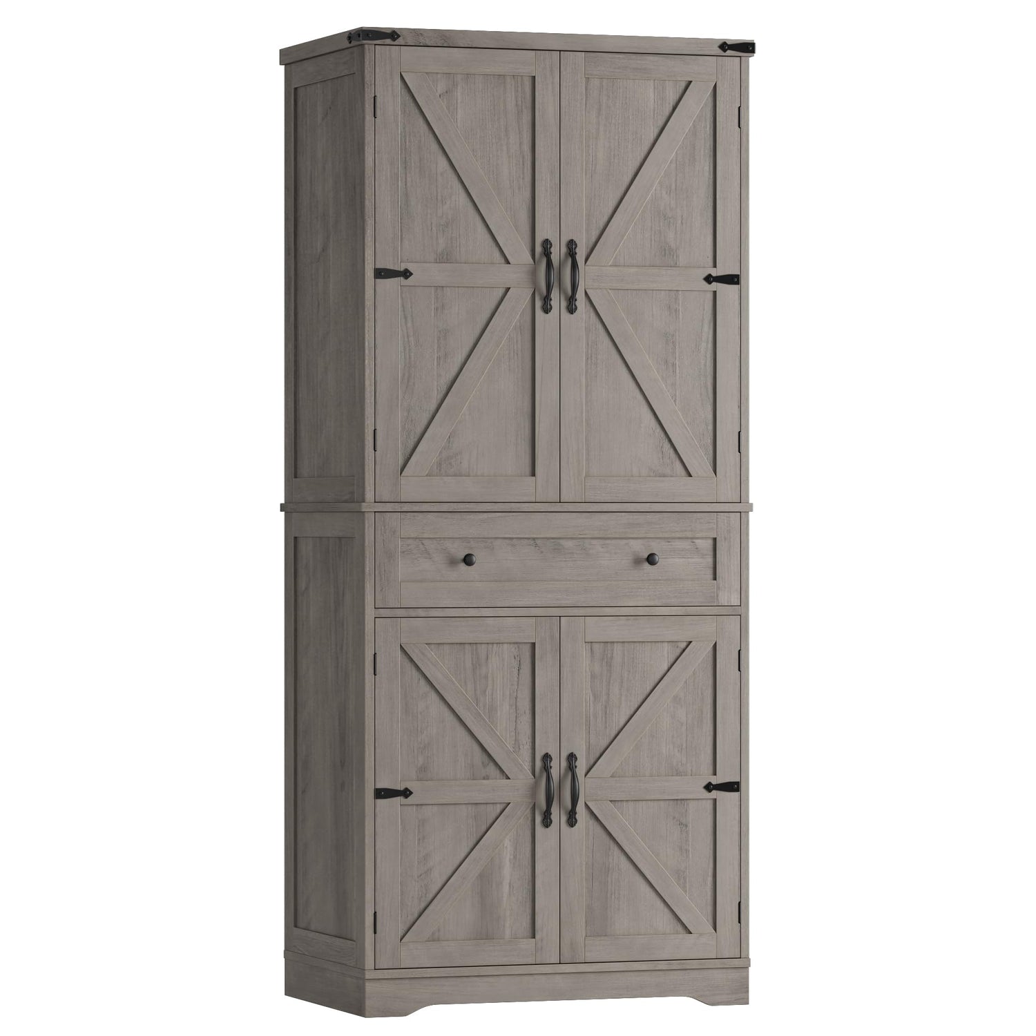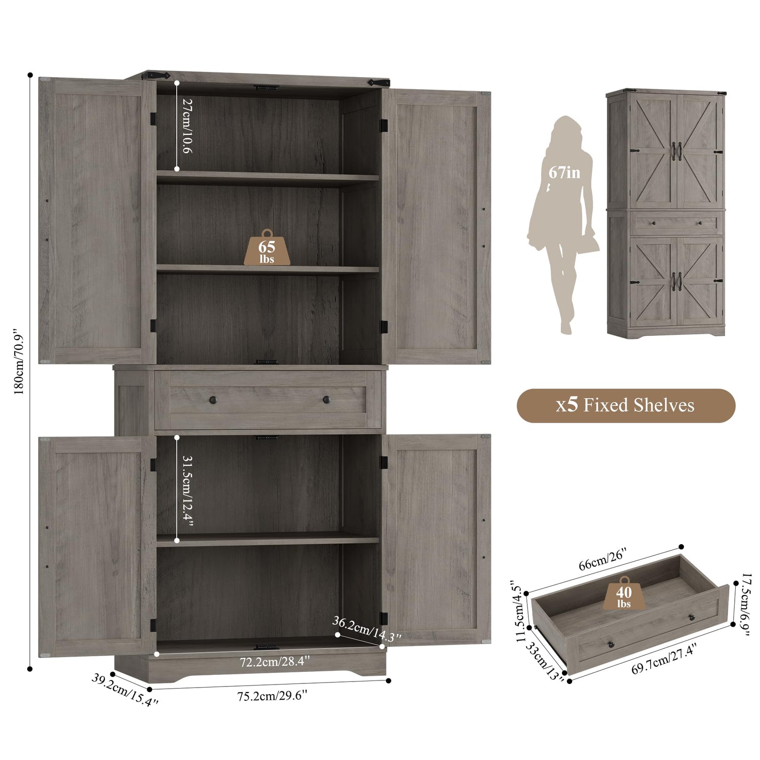 HOSTACK 71" Tall Pantry Cabinet, Farmhouse Kitchen Pantry with Storage Shelves, Barn Doors Food Storage Cabinet, Freestanding Kitchen Hutch with Large Drawer for Dining Room, Living Room, Ash Gray