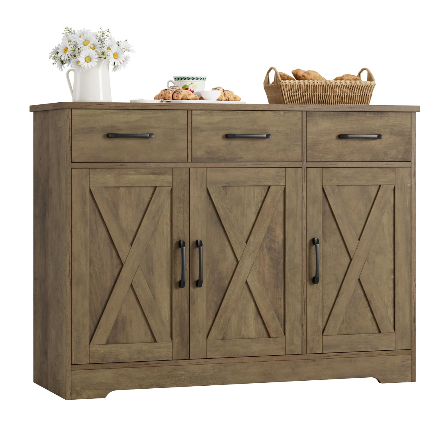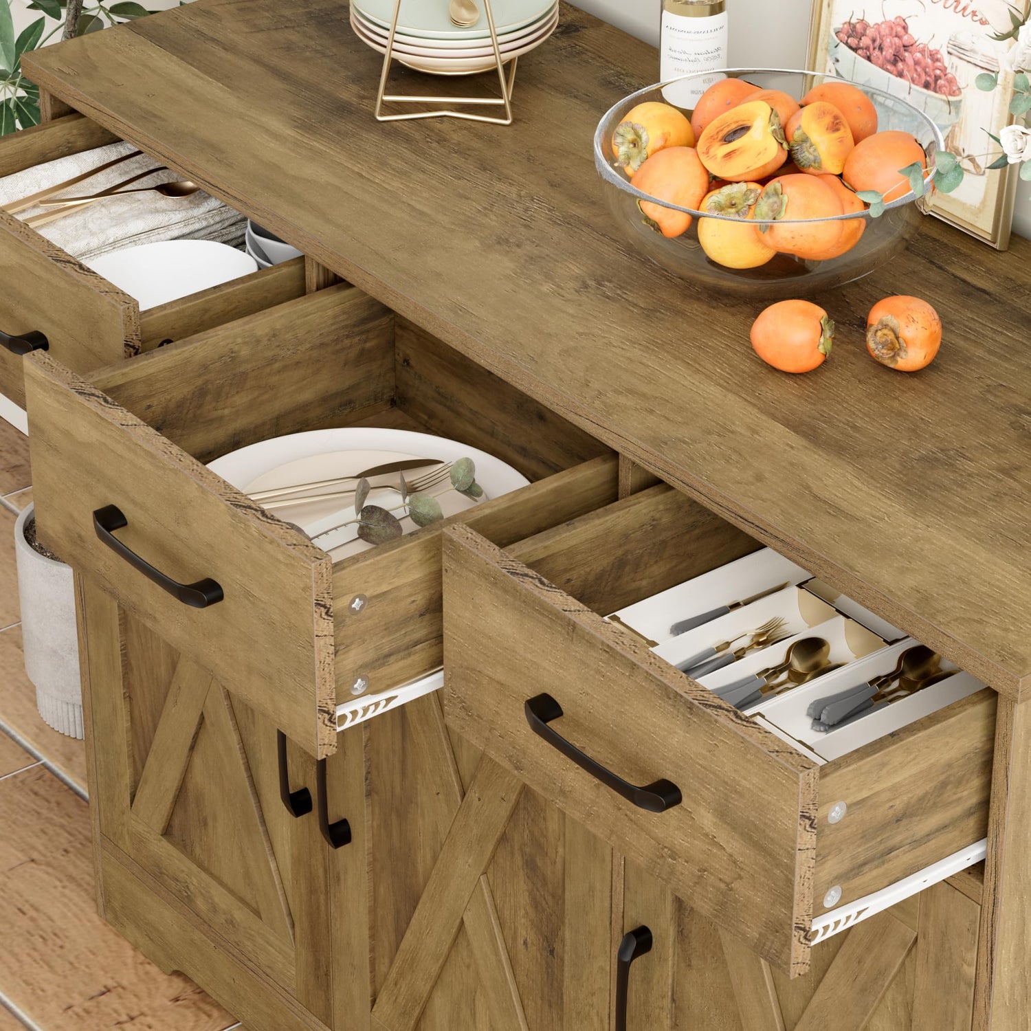 - γπππππ πππππππ πππππγThe buffet cabinet incorporates both open and closed storage space to meet your different needs. Spacious tabletop can place items for easy access, three handy drawers help classify knives and forks neatly, while two bottom cabinets each with internal shelf offer smart space to accommodate mugs, extra dishware, and other essentials