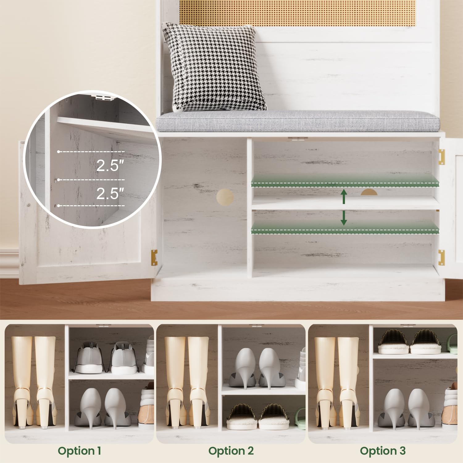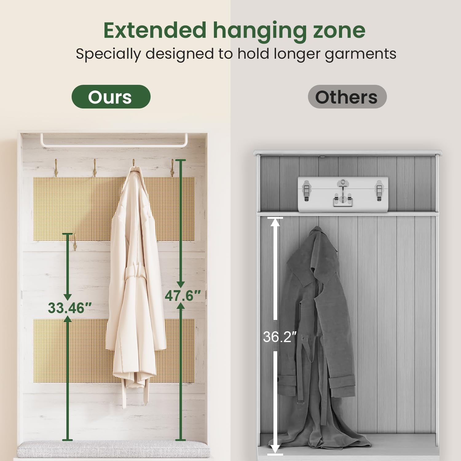 - [5-in-1 Multifunctional Design] Declutter your entryway with this all-in-one hall tree. Featuring a clothing rod, 7 tri-hooks, a comfy bench, a 3-compartment shoe cabinet, and a top shelf for extra storage. The right-side shelf of the shoe cabinet is adjustable to 3 heights, making it perfect for storing items like heels, boots, or bags. Designed for coats, scarves, and long garments at the perfect height, it keeps your space organized and stylish. Perfect for small and large spaces-your ultimate solution for a tidy, welcoming home