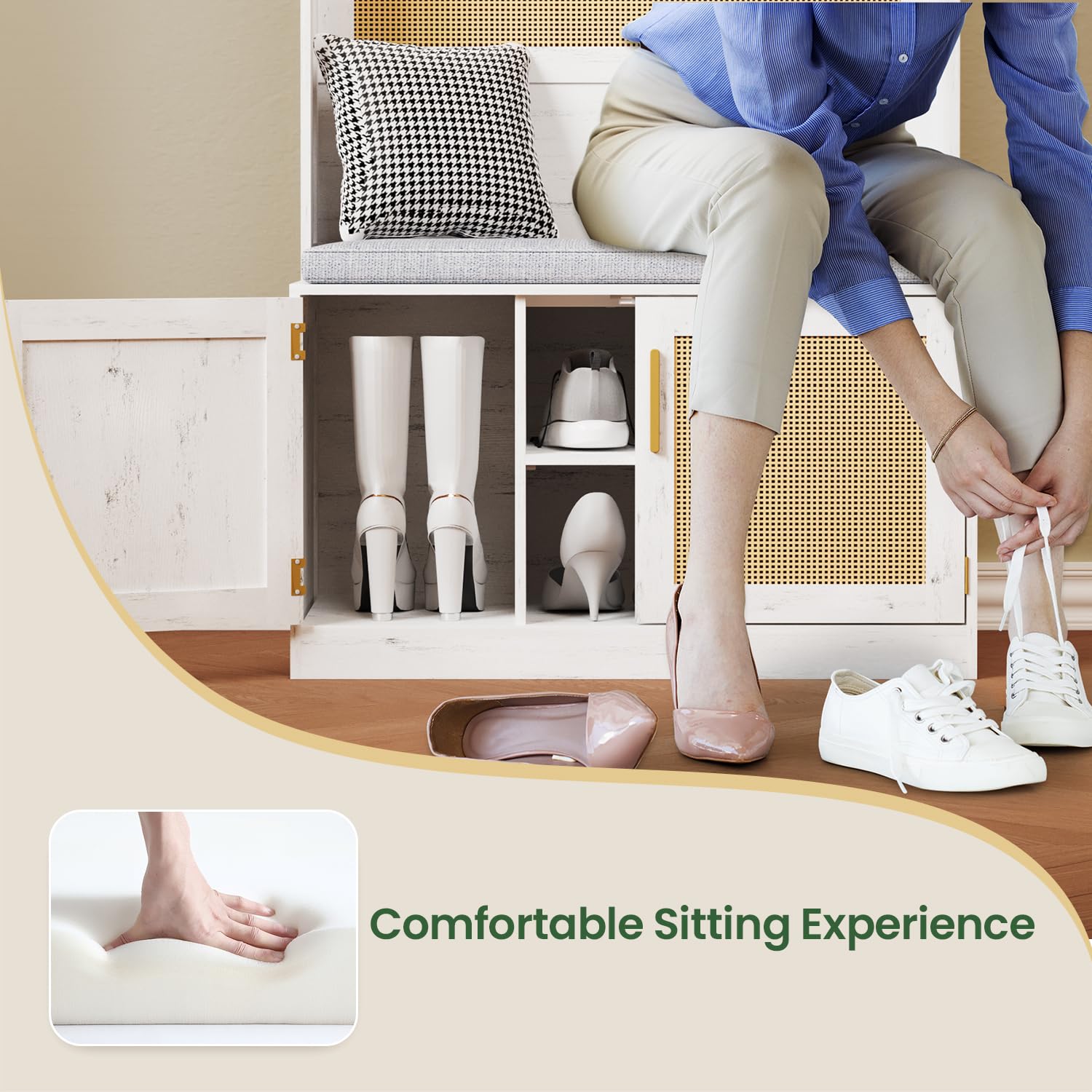 - [Upgrade Your Comfort] Relax and unwind with the built-in bench featuring a thick, 15.4" x 1.6" cushion made of high-resilient foam for lasting comfort. The anti-slip base ensures stability, while the removable, easy-to-clean cover is perfect for busy households. This stylish hall tree with shoe bench helps you unload the day's fatigue in comfort and style