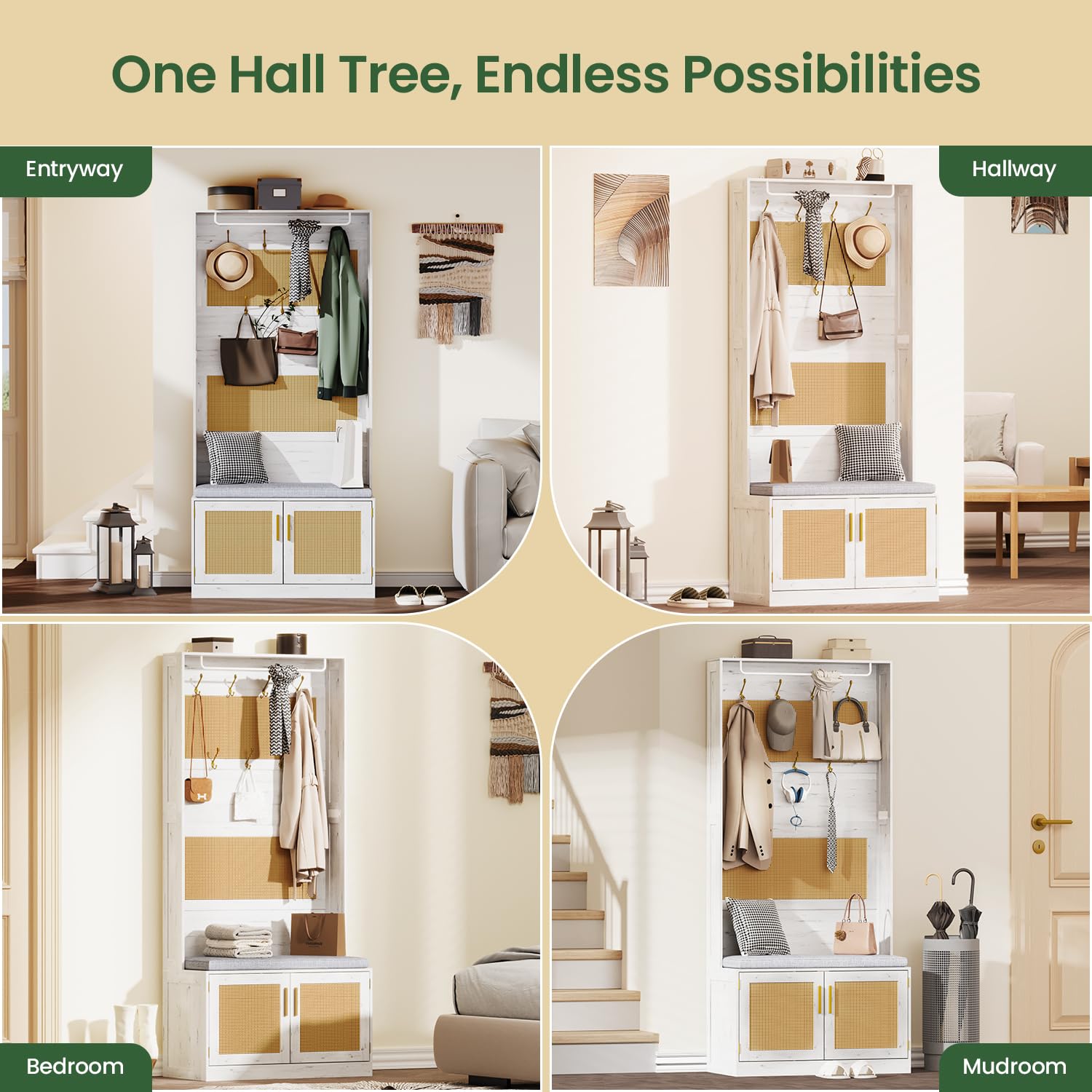 - [Stylish Boho with Modern Ease] Bring charm and style to any space with this Bohemian-inspired hall tree. Perfect for the hallway, mudroom, foyer, or office, this entryway organizer combines farmhouse flair with modern functionality to elevate your home while keeping everything neatly organized