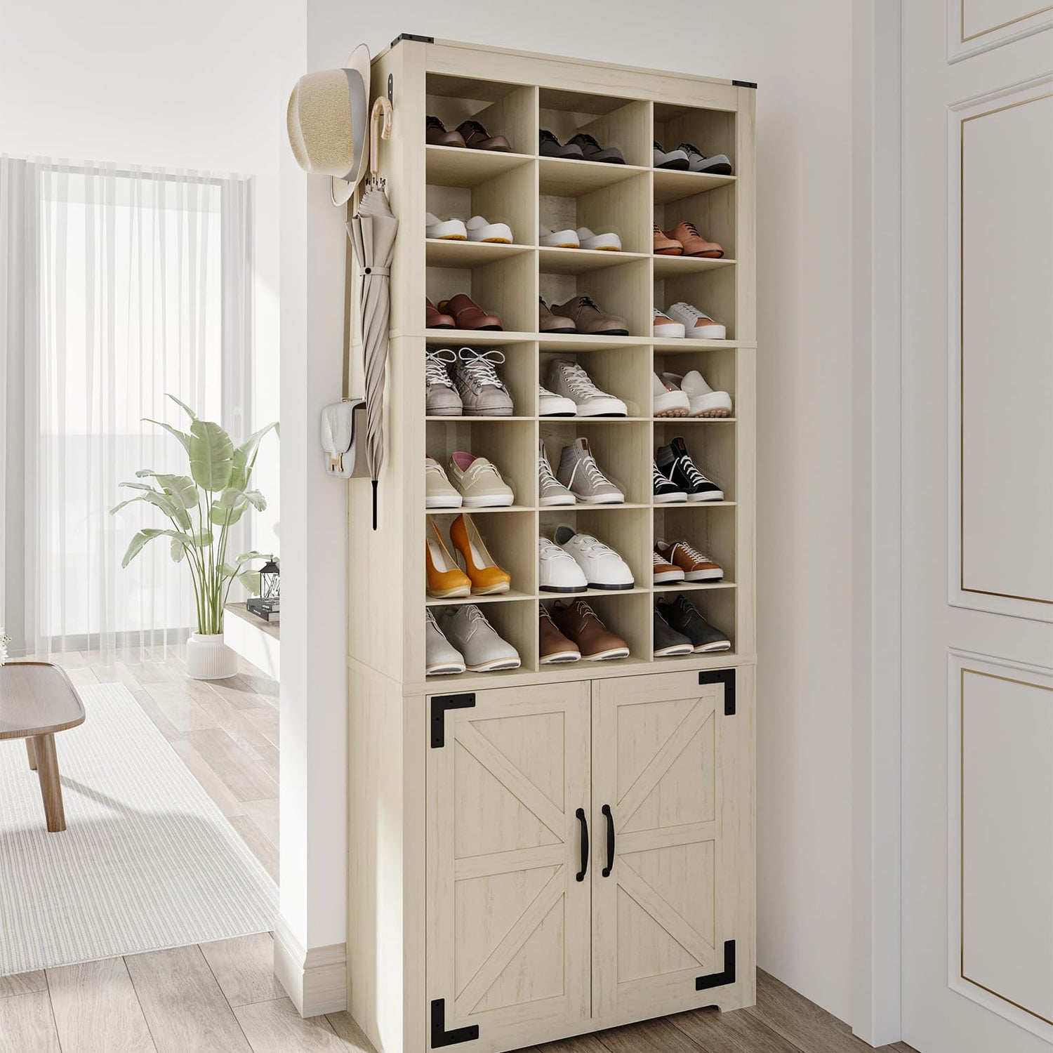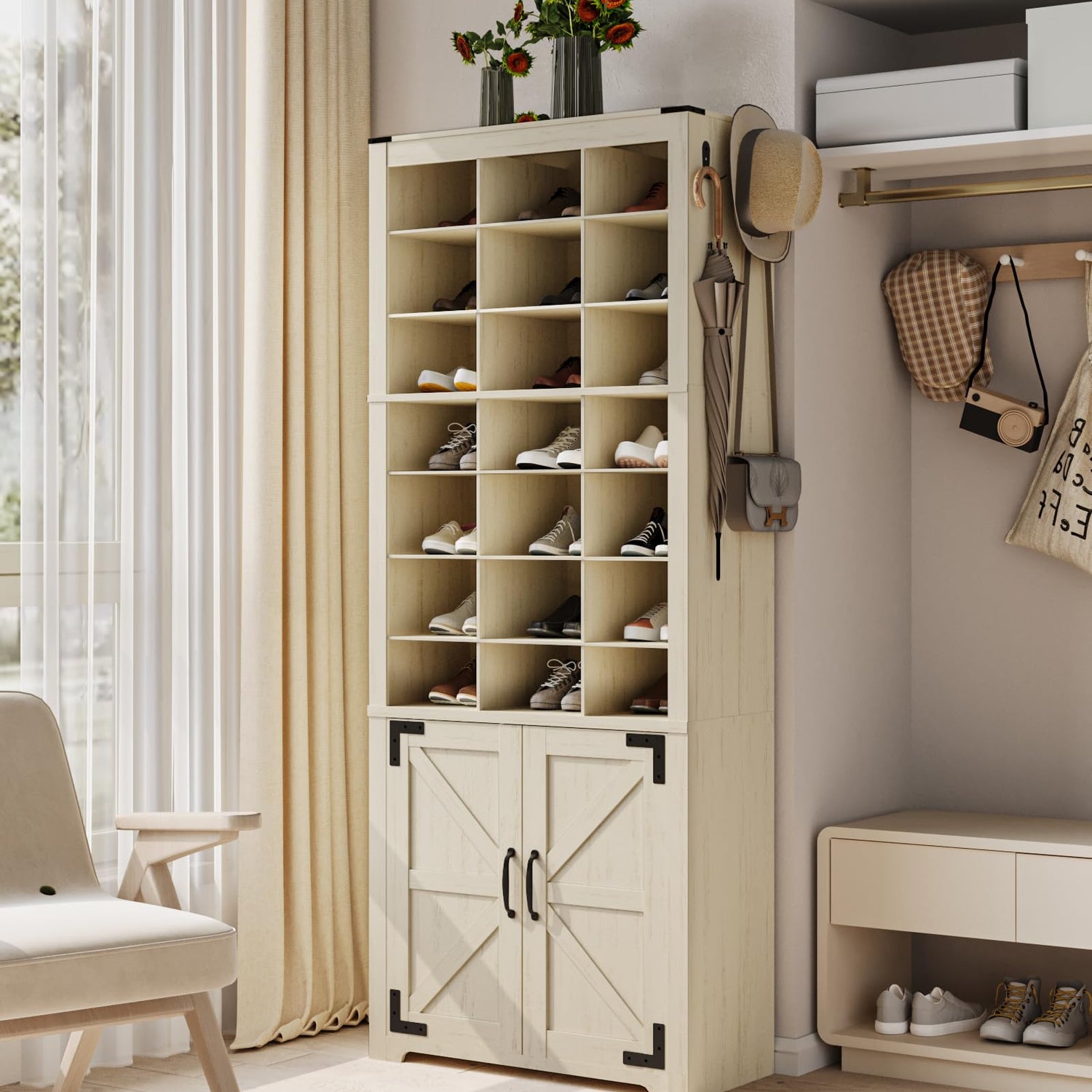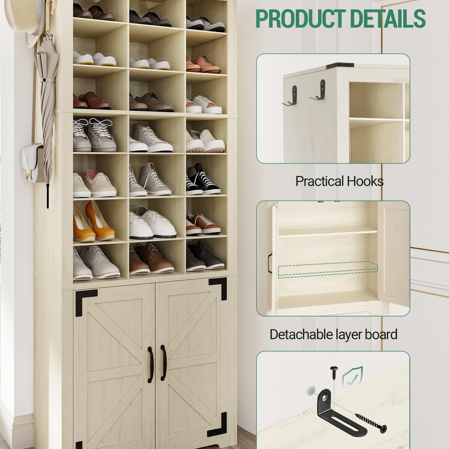Hzuaneri Shoe Storage Cabinet with Doors, 30 Pairs Free Standing Closet Organizer, 8.8" Widened Cell Wood Shoe Shelves, 10 Tiers Vertical Shoe Rack for Entryway, Bedroom, Rustic White SR20914X