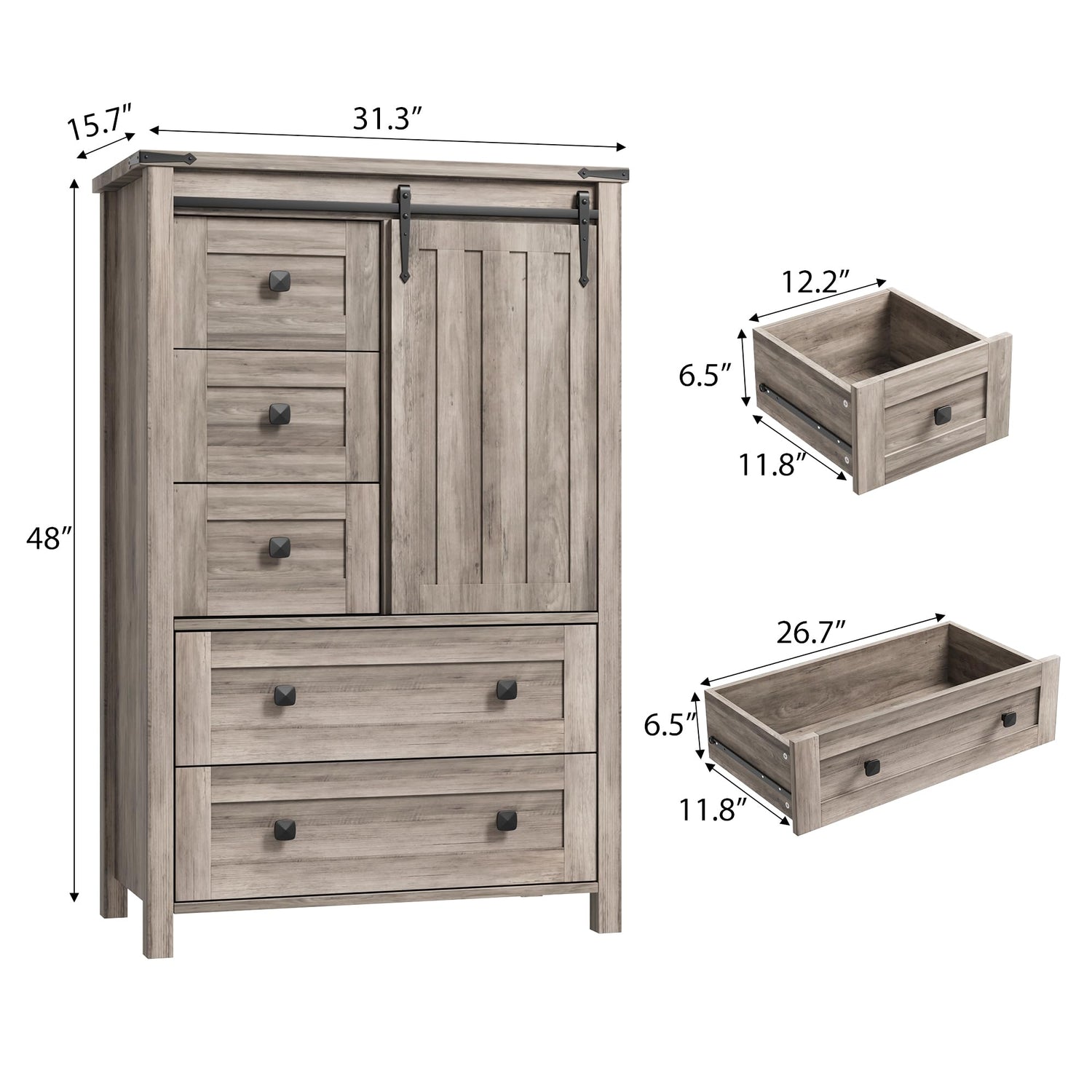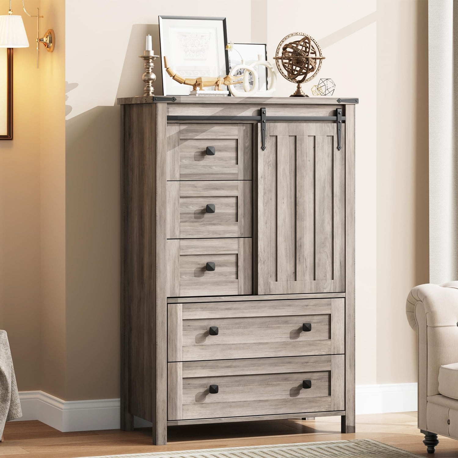 IDEALHOUSE Farmhouse 5 Drawer Dresser for Bedroom, 48" Tall Wood Dresser Chest of Drawer with Sliding Barn Door, Adjustable Shelf, Storage Organizer for Bedroom, Hallway, Living Room, Kitchen, Grey