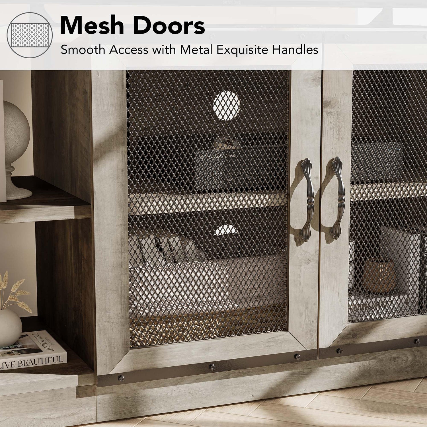 - Industrial Farmhouse TV stand: Blend the timeless appeal of traditional farmhouse style with rustic charm. Featuring classic adopts a visual mesh door designed to allow you to hide or reveal this home entertainment center freely