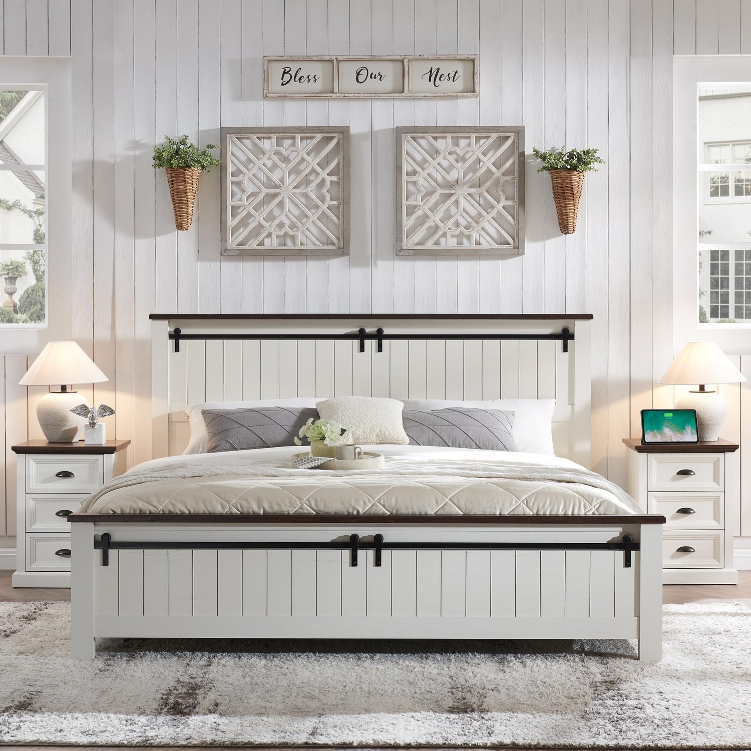 Crafted in a timeless white finish, it features a striking 47" headboard and a footboard inspired by sliding barn doors, complete with sleek black metal hardware. The bed frame not only enhances your décor but also adds inviting texture and clean lines, making it a perfect addition to the IFGET Bedroom Furniture Collection.