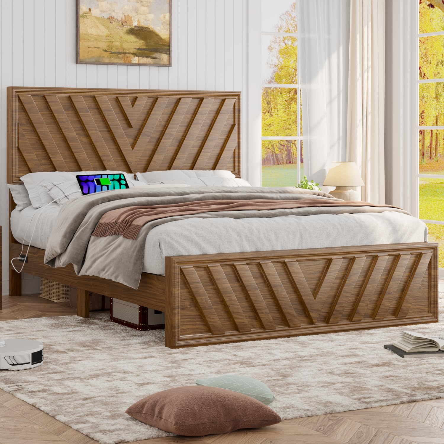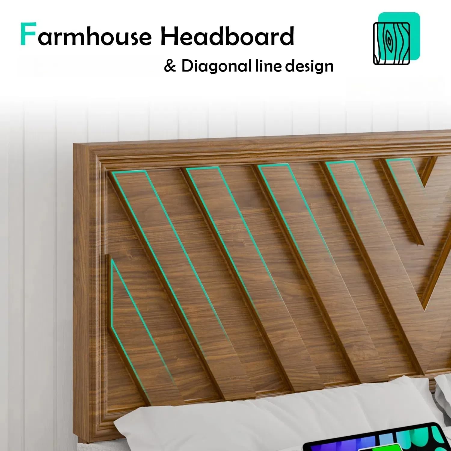Incyneva Queen Bed with Adjustable Headboard, Farmhouse Platform Bed Wood with LED Light and Charging Station, Diagonal Line & Rustic Brown