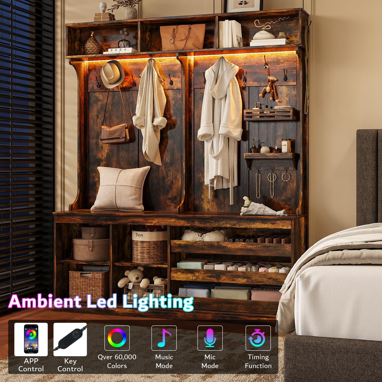 - 【Smart LED Light】Entryway hall tree comes with an integrated smart LED strip (remote control, mic/flash mode, etc). Sound-sensitive LED lighting not only eases nighttime use but also adds warmth & convenience to entryways, stairwells, or bedrooms