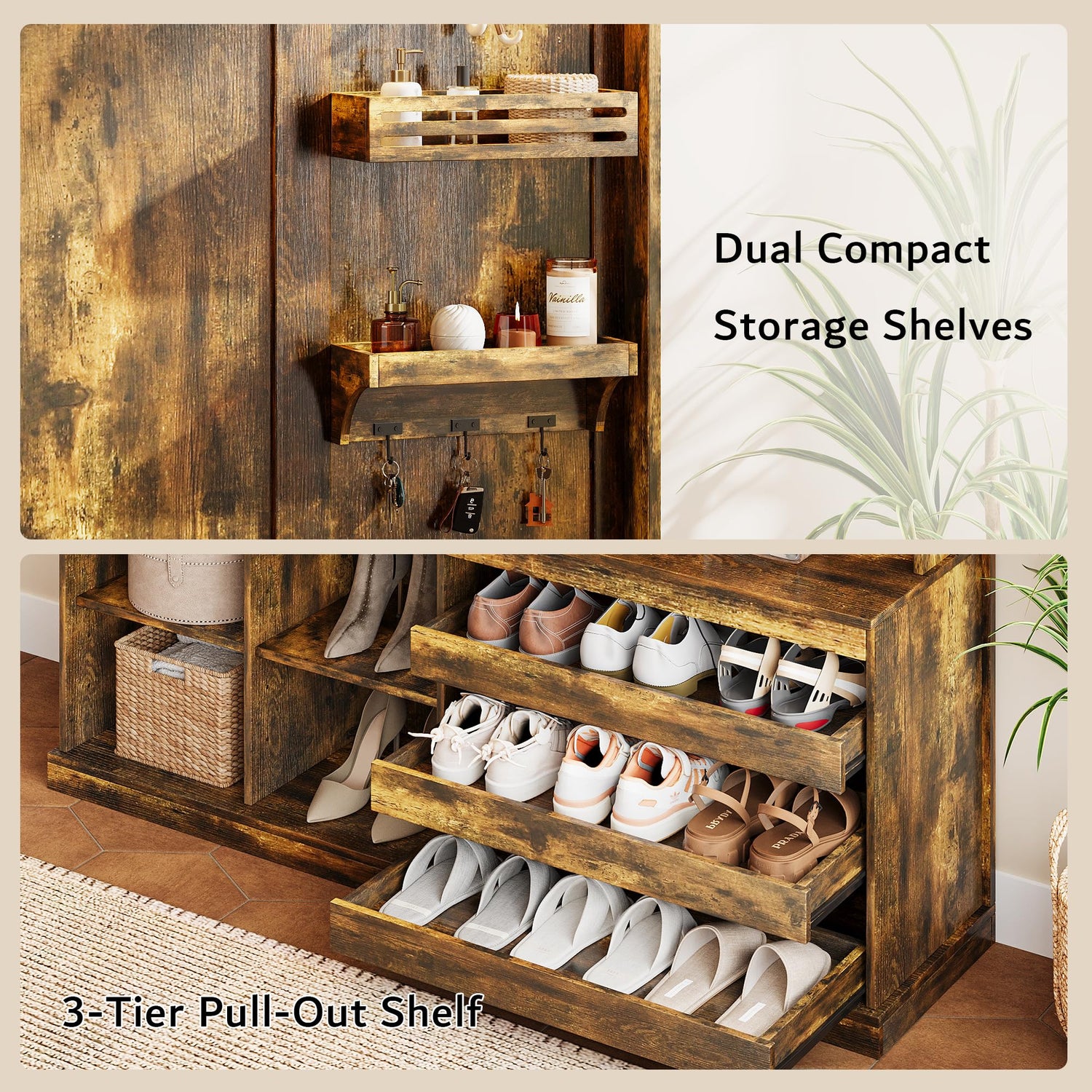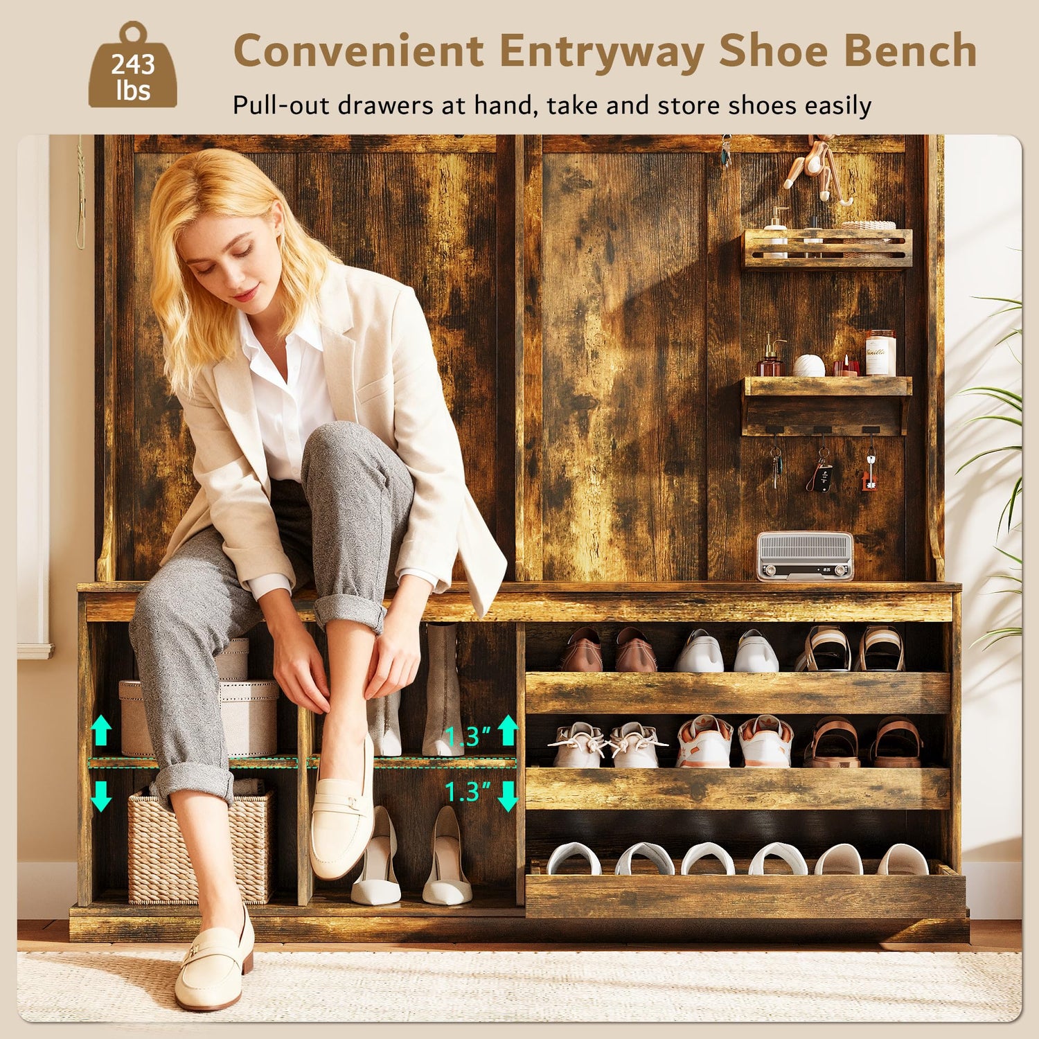 - 【6-in-1 Design】Seamlessly integrating coat hooks, a shoe bench, bottom shoe storage, upper shelving, and a top display shelf, just one storage rack fulfills all entryway storage & decor needs—say goodbye to clutter