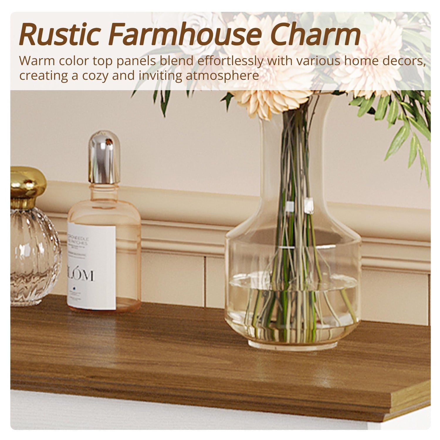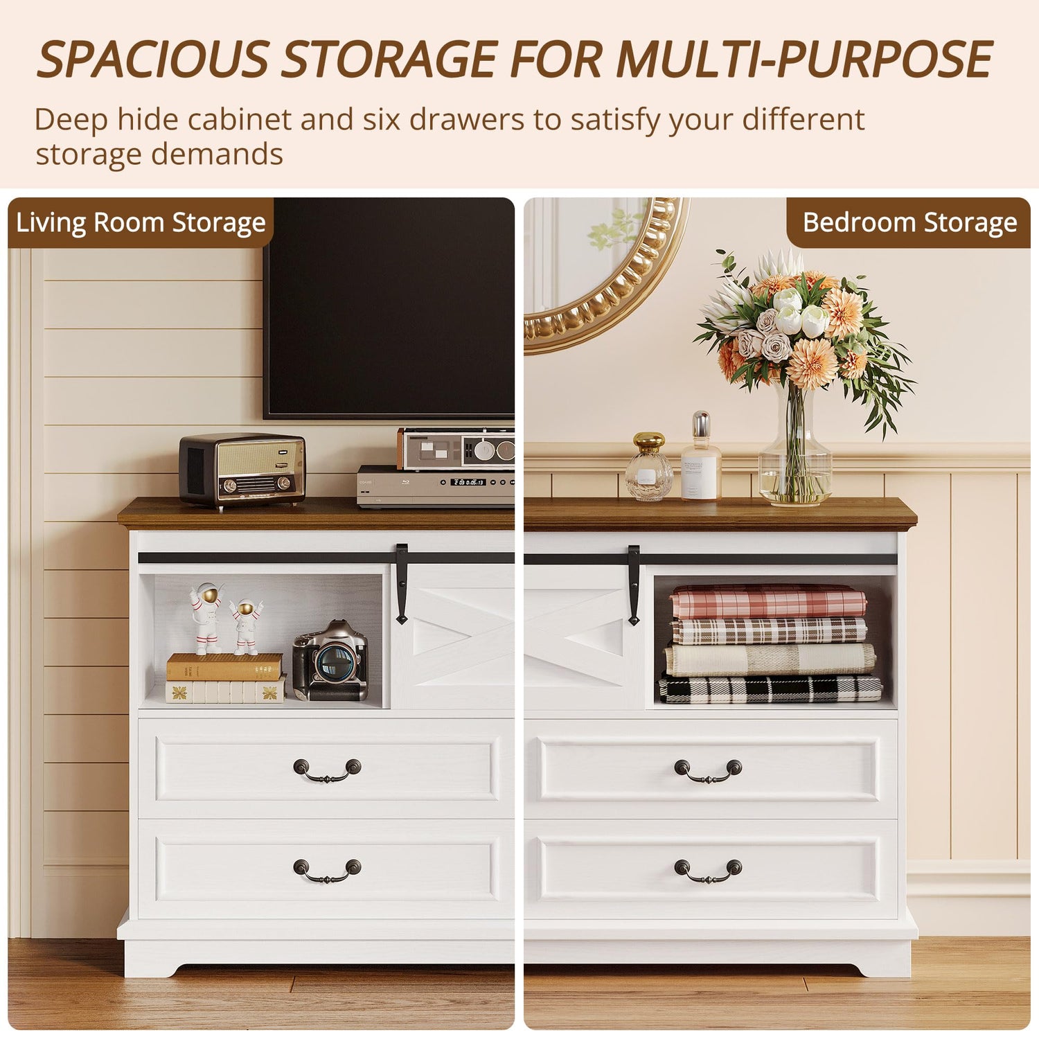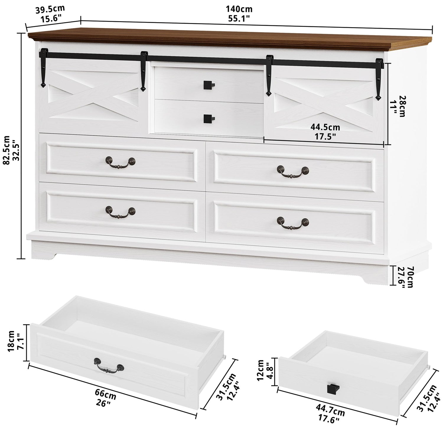 - Farmhouse 6-Drawer Dresser: This dresser combines farmhouse charm with practical storage solutions. It features four large drawers, two smaller drawers, and two barn-door cabinets at either end for extra space. Measuring 55.1''W x 15.6''D x 32.5''H, it offers ample room for organizing socks, clothing, linens, cozy throw blankets, or pillows.