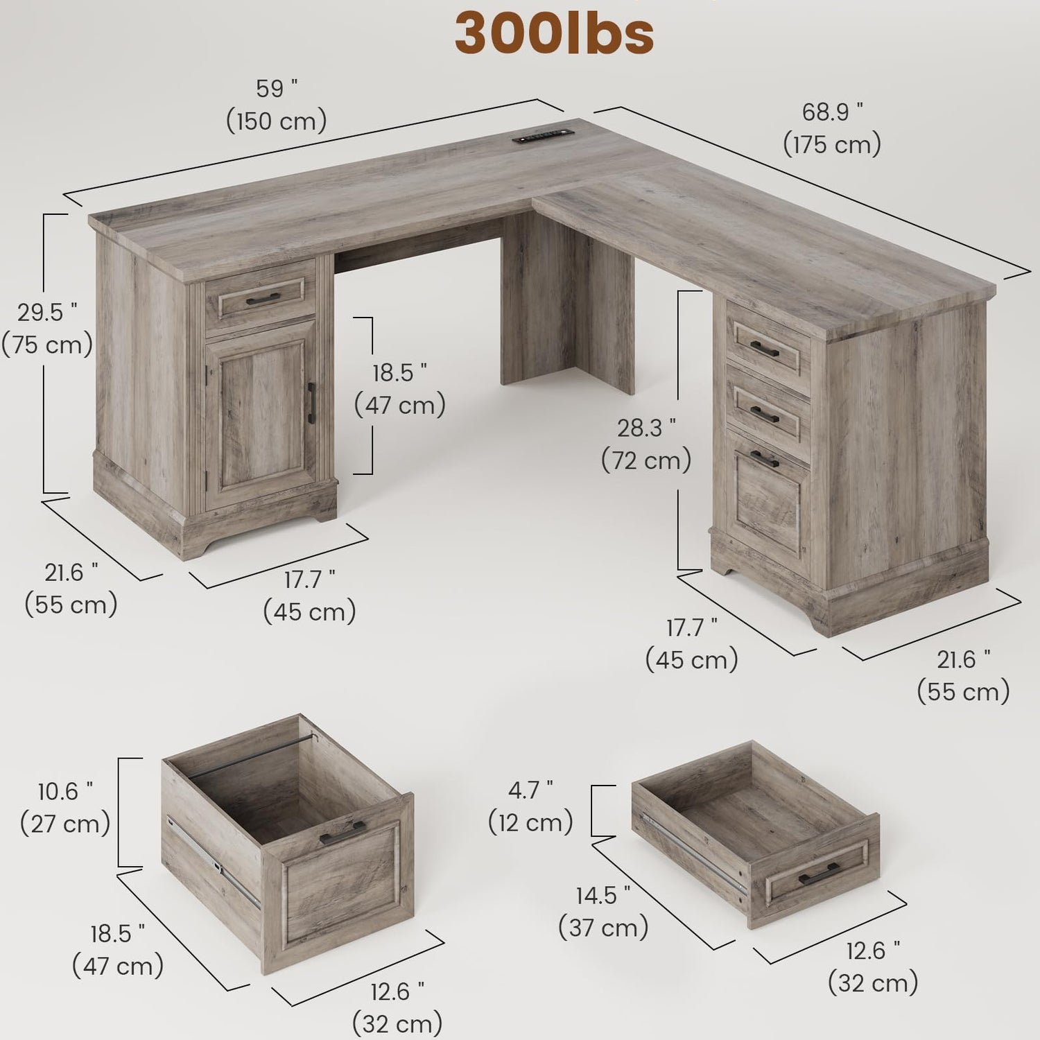 Measuring 69"L*21.6"W and 59"L*21.6"W, the spacious desktop can easily hold files, computers, printers without croweded. It features 4 drawers and a storage cabinet which can accommodate a large number of files, books, and other office essentials, provide convenient organization for a clutter-free workspace.