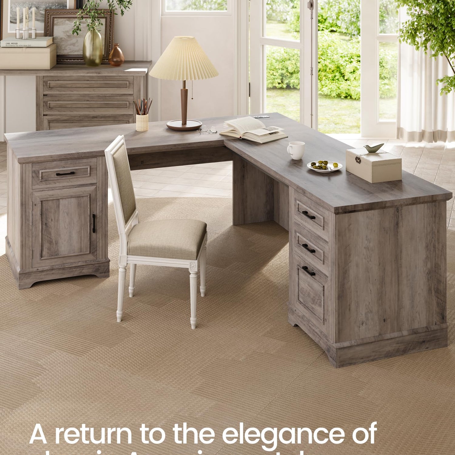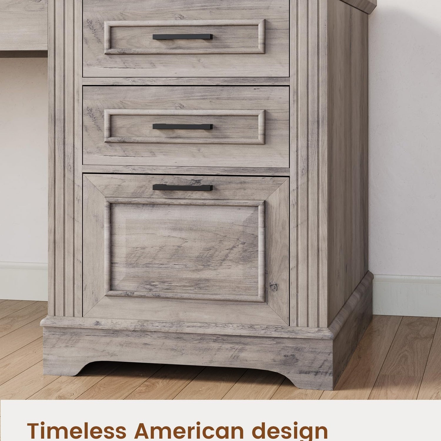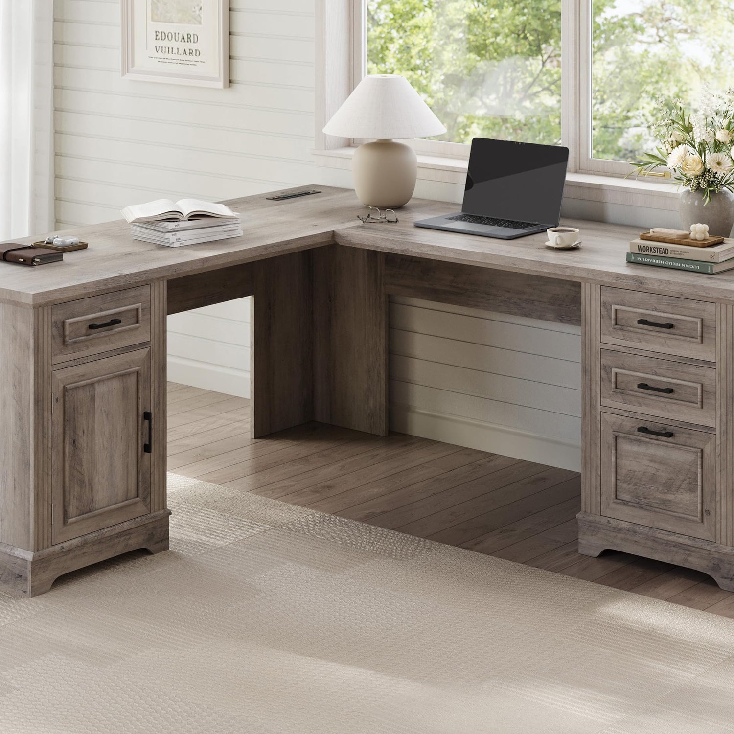 Itaar Farmhouse L Shaped Desk, Executive Computer Desk with Drawers and Storage Cabinet, Home Office Desk with File Drawer and Power Outlet, Corner Desk, Workstation for Office Home, Grey