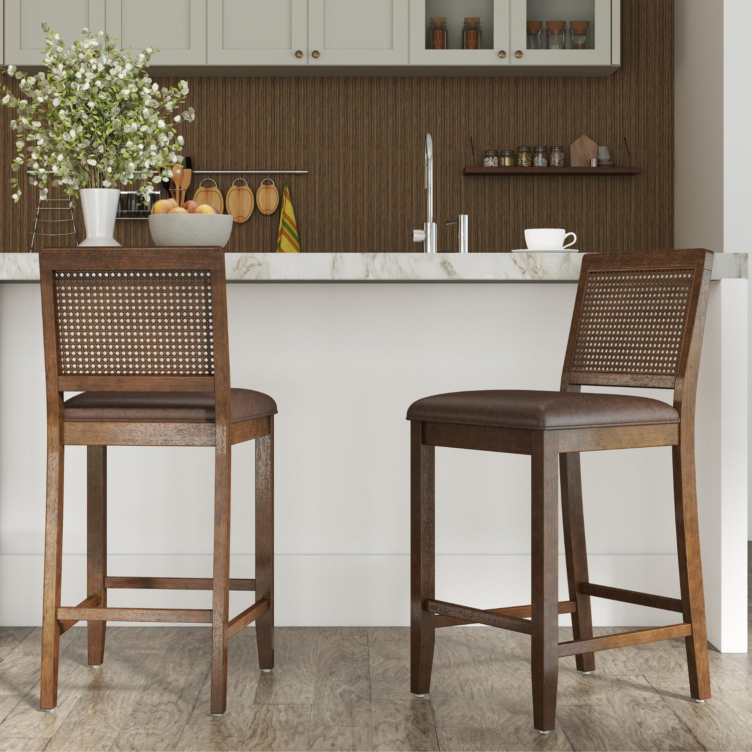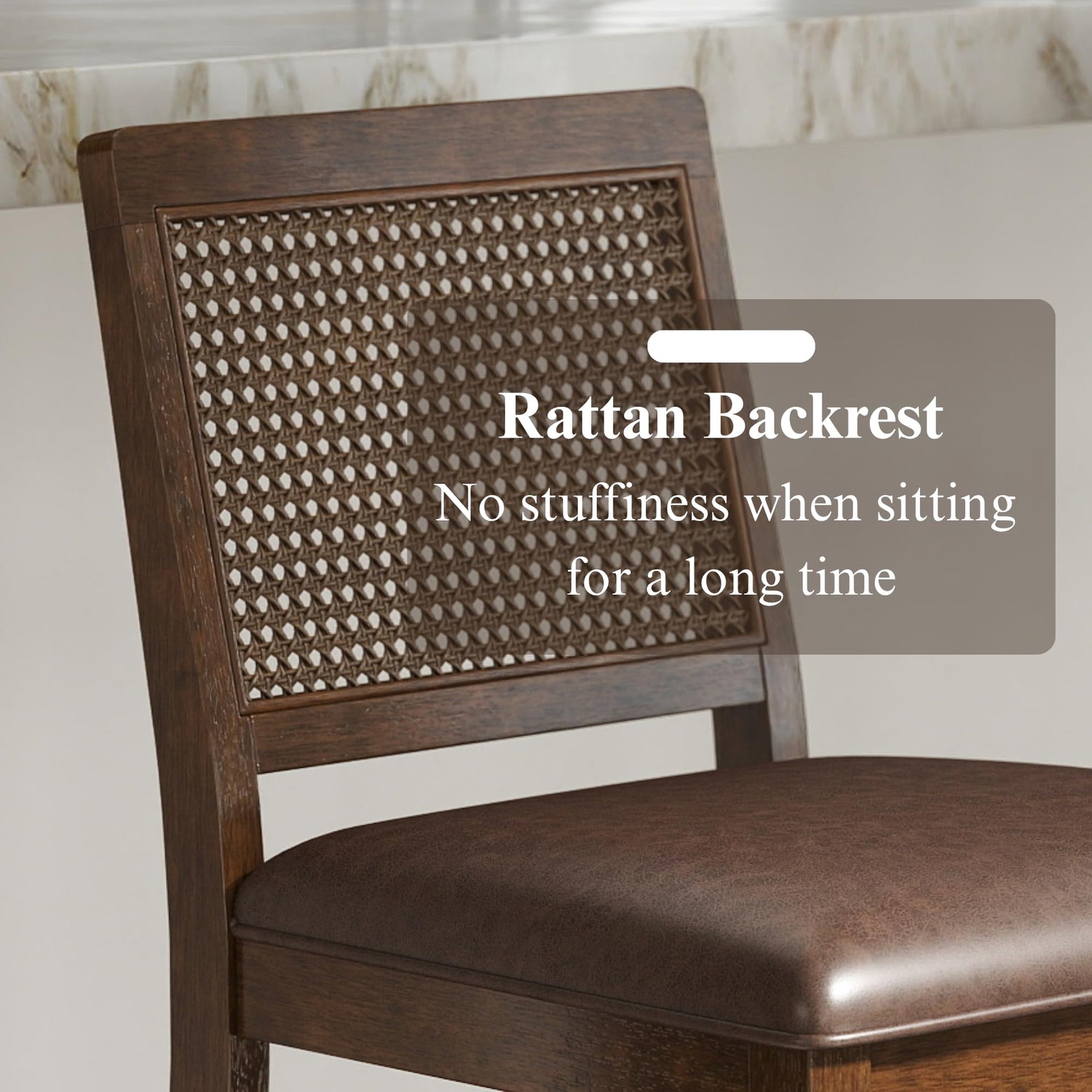 Janoray 26" Counter Height Bar Stools Set of 2, Rattan Woven Barstool with PU Leather Upholstered Seat and Solid Wood Frame Farmhouse Dining Chairs for Kitchen/Island Pub/Bistros/Restaurant