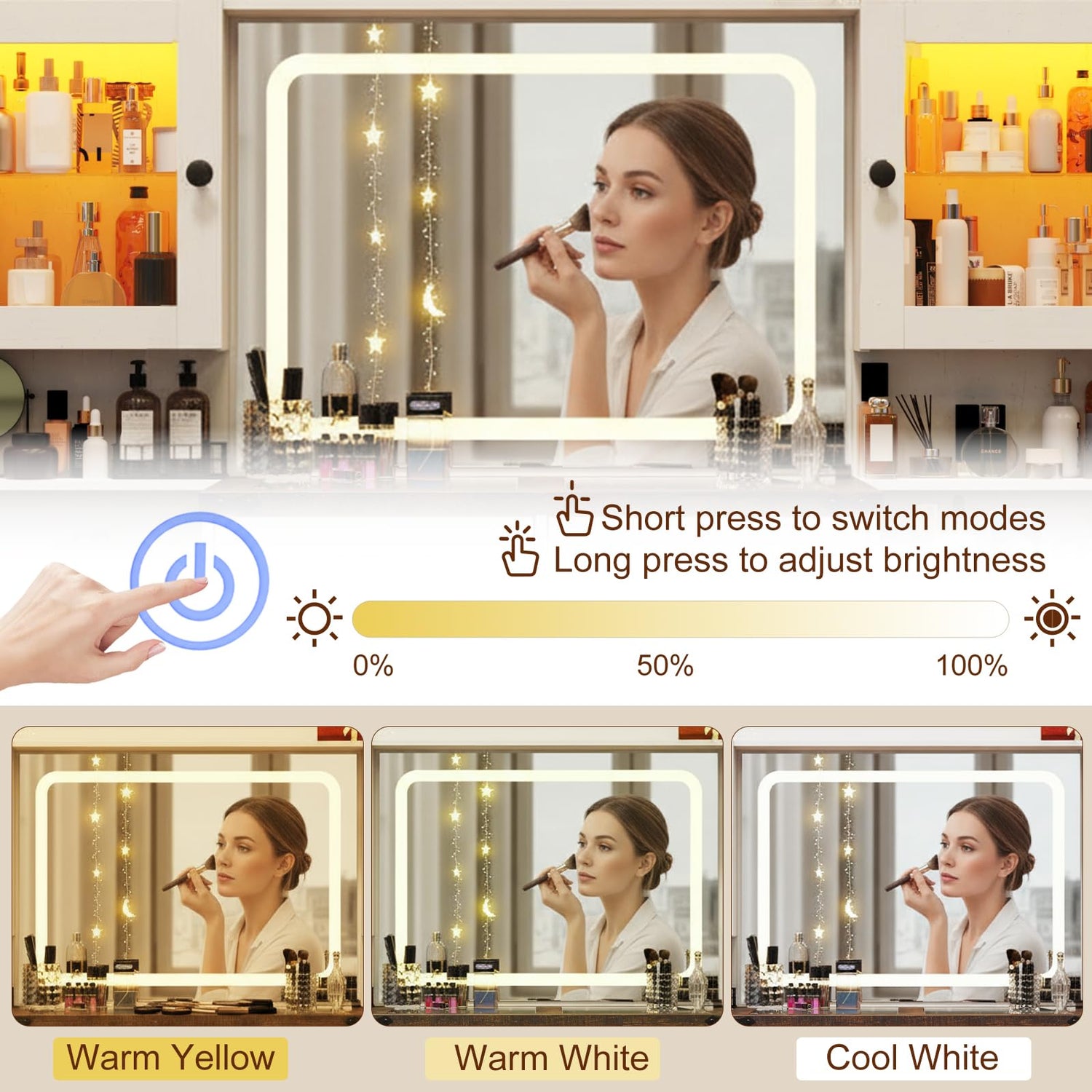 • Customizable Mirror Light: The glass top vanity desk with 3 types of lights (cool, natural, and warm light) and multiple brightness are both adjusted by the touch screen. Whether it's daytime or evening, it's great for applying makeup and skincare. Say goodbye to poorly lit rooms and hello to salon-quality results every day.
