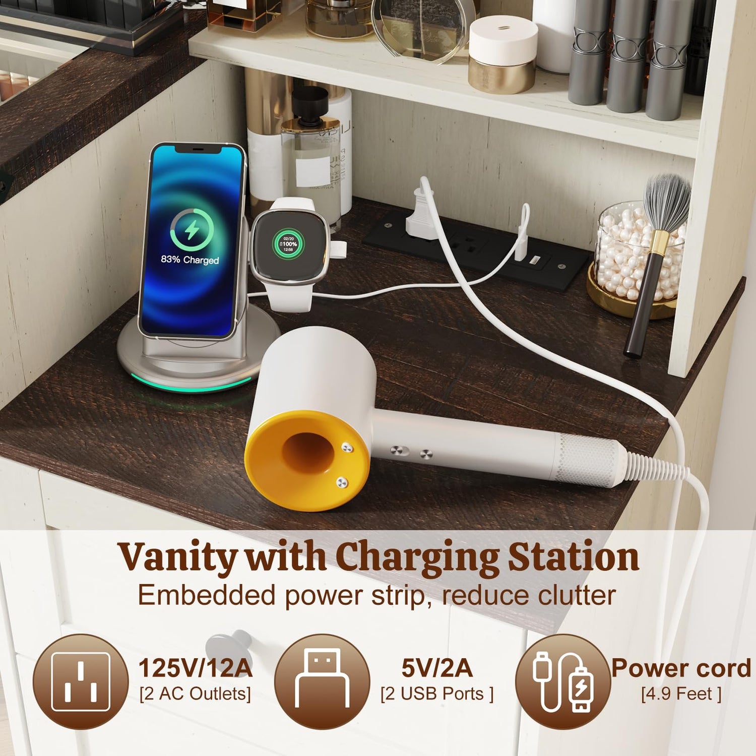 • Convenient Charging Station: This vanity desk with lights comes equipped with a built-in power outlet, which includes 2 USB ports and 2 power outlets. No more scrambling for extra power strips and only plug your hair dryer, curling iron, or other makeup machine into the 2 charging outlets for steady power and you can also charge your phone or ipad while applying makeup at the same time without leaving your seat.