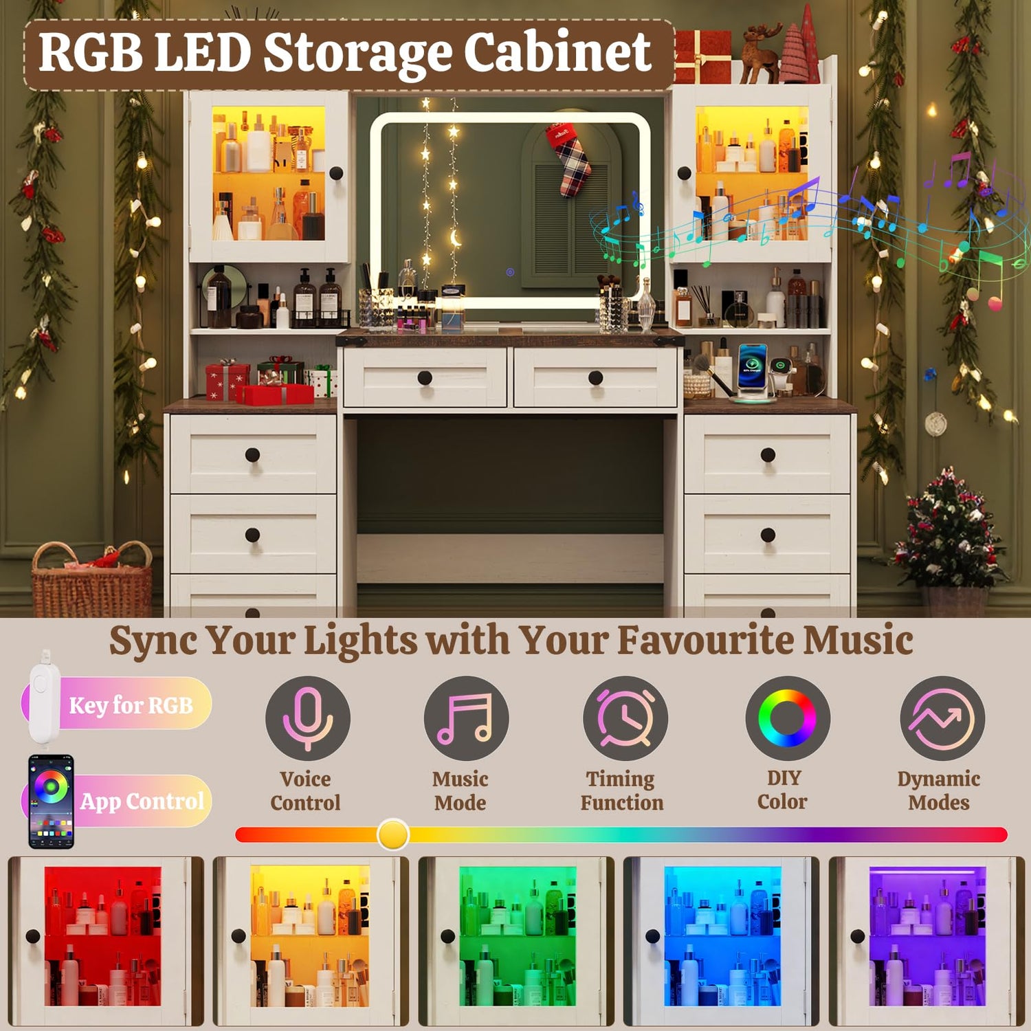 • Spacious Storage: This wood farmhouse vanity boasts 8 smooth-gliding drawers, 2 versatile open shelf compartments, top storag space and 2 adjustable RGB LED lights color glass-front display cabinets, for your makeup, nail polish, jewelry, hair tools, brushes, skincare, perfume, and daily necessities, keeping your room neat and organized. The 2 drawers with glass tops are great for displaying your jewelry, accessories, and look more expensive and advanced and are easy to take.