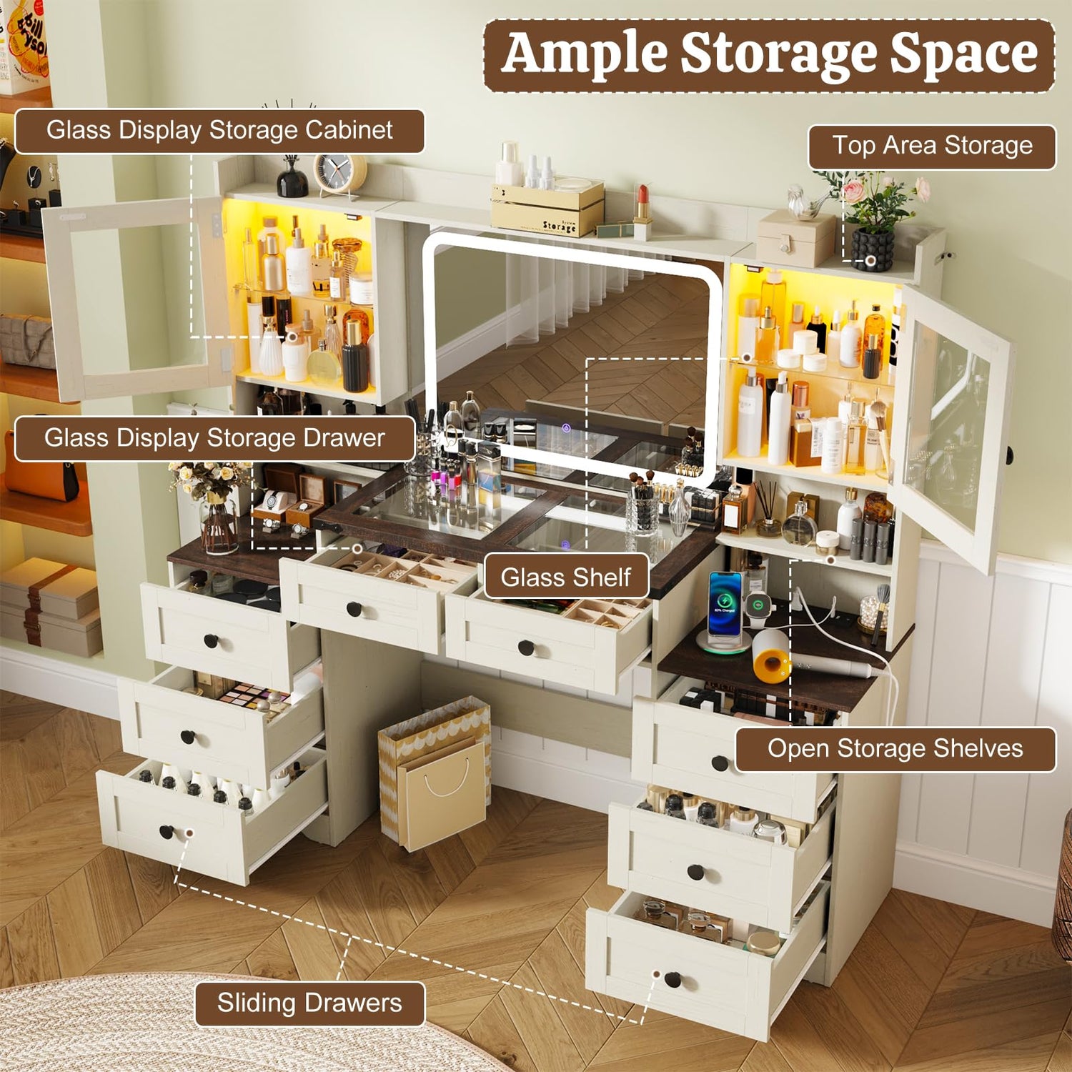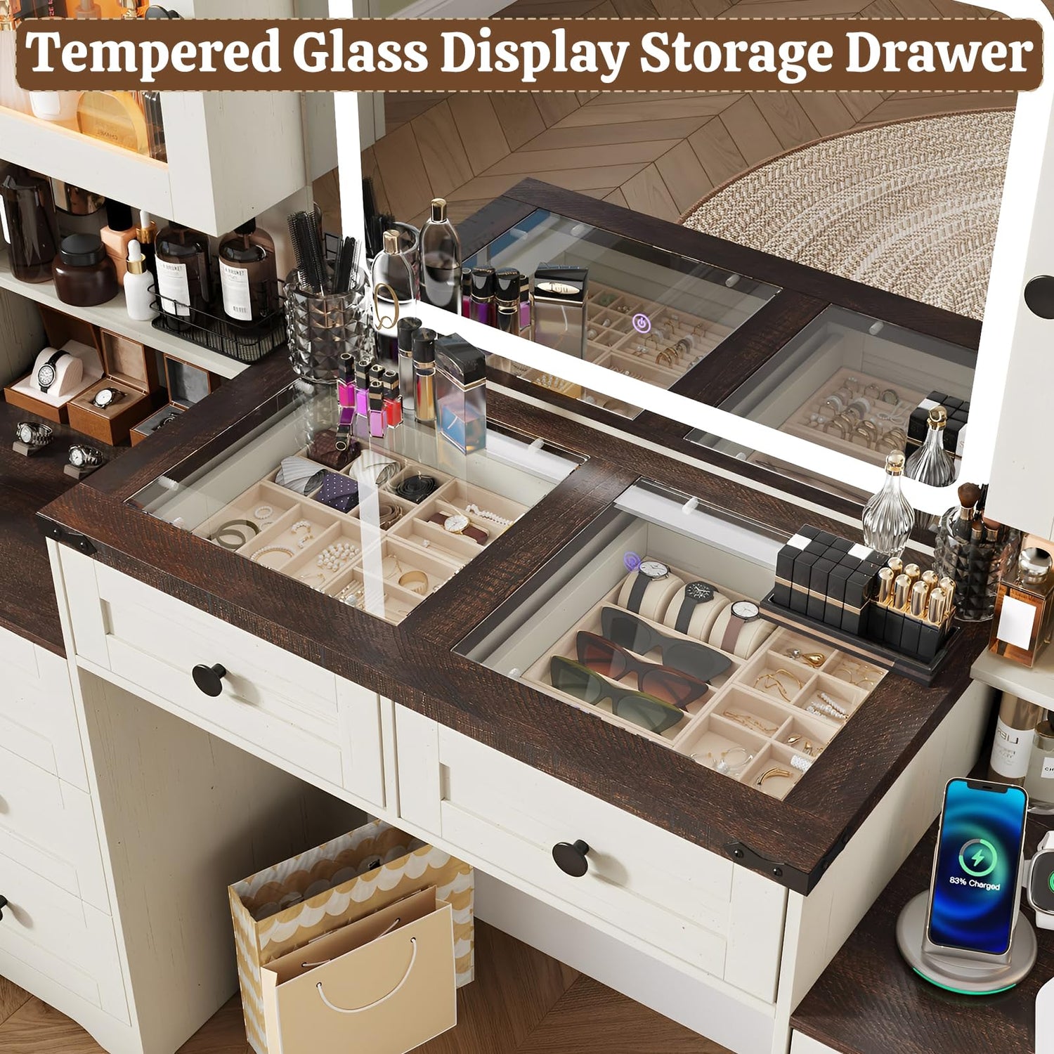 jiteentarou 60" Large Farmhouse Vanity Desk with LED Mirror, Lights and Charging Station, Glass Top Makeup Vanity Table w/8 Drawers, LED Glass Storage Cabinet, Dressing Table for Bedroom, Rustic White