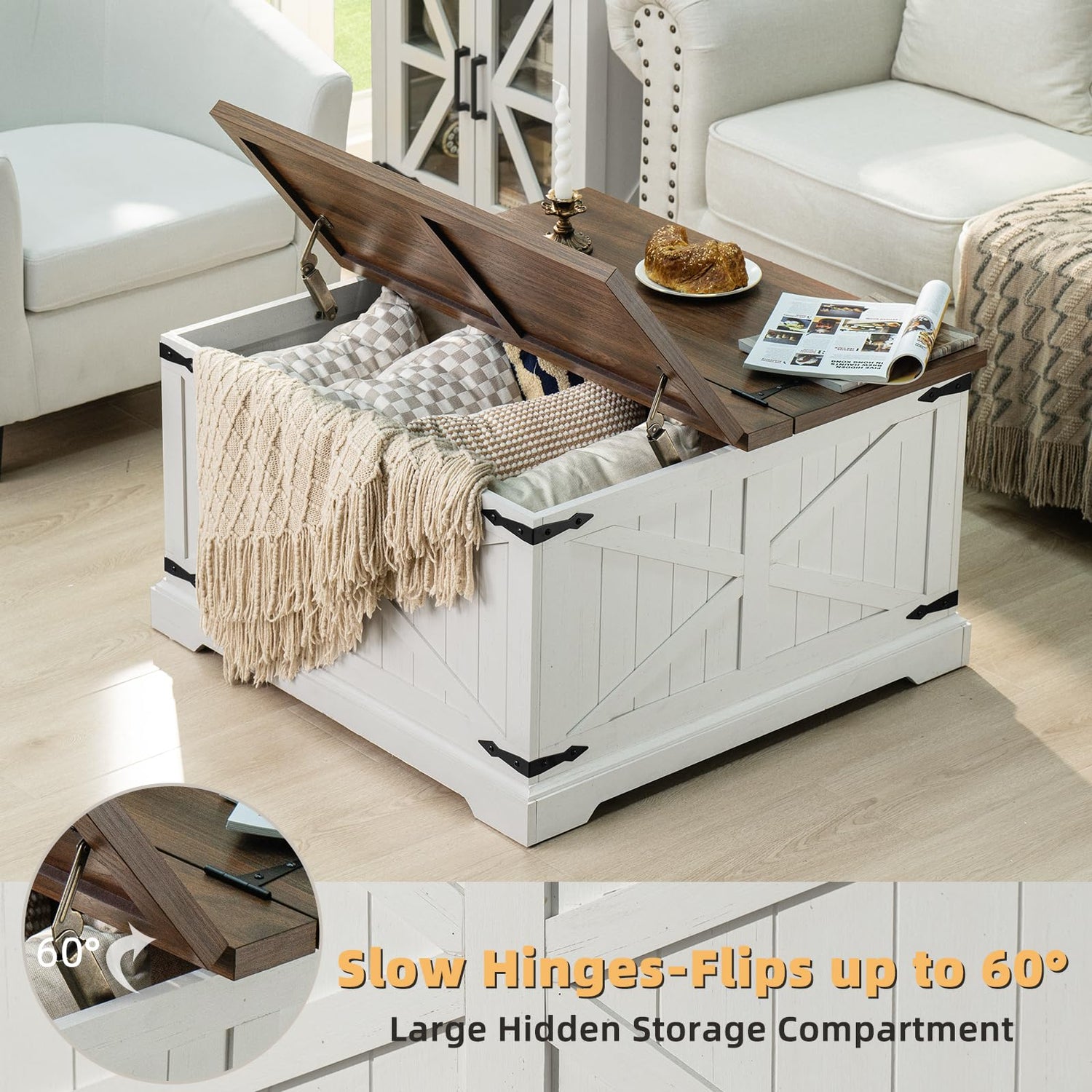 Joaxswe Farmhouse Coffee Table with Large Hidden Storage Compartment, Antique White Square Center Table, Wood Rustic Low Modern Living Room Tables with Hinged Lift Brown Top & Wooden Arc Base