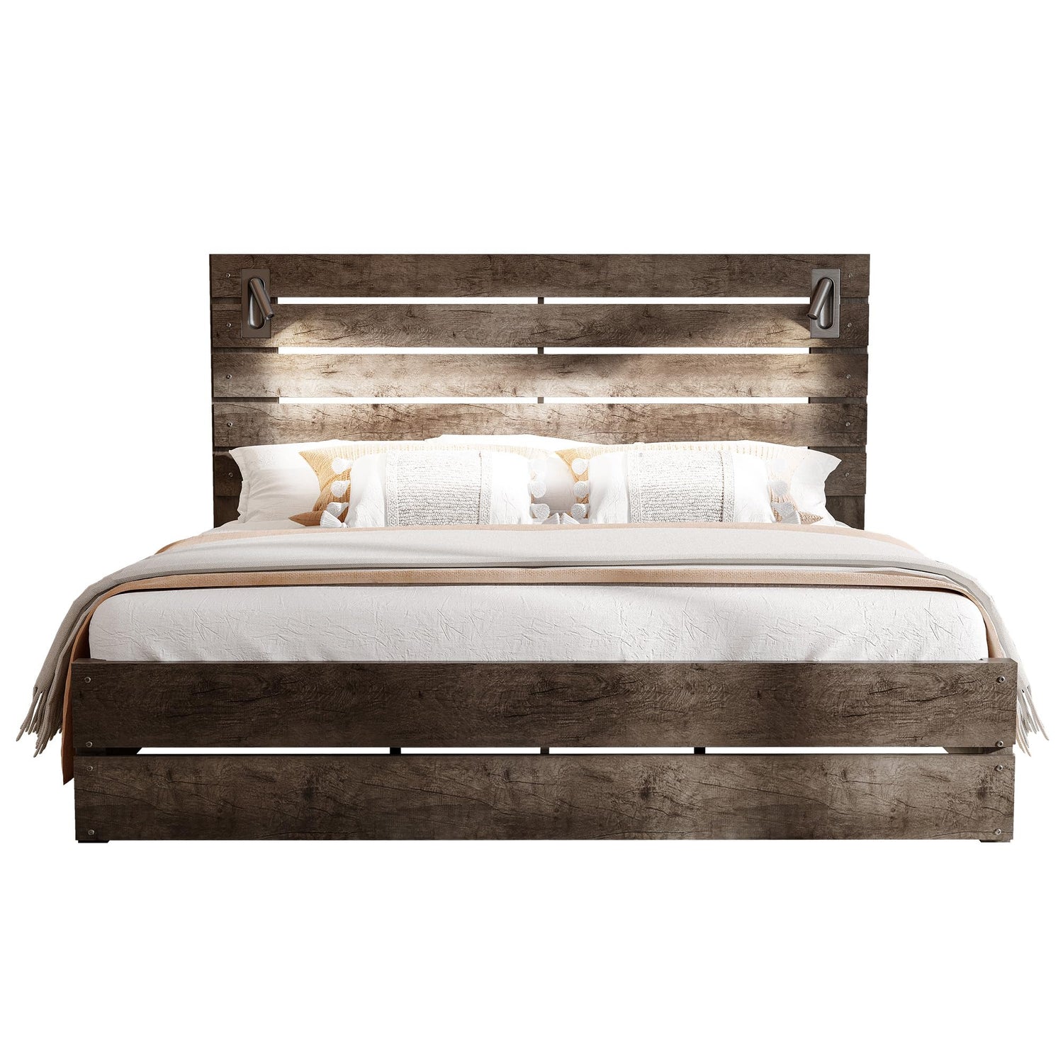 Jocisland Full Size Farmhouse Bed Frame with 51" Headboard, LED Reading Lights, Rustic Wood Look, No Box Spring Needed, Rustic Gray