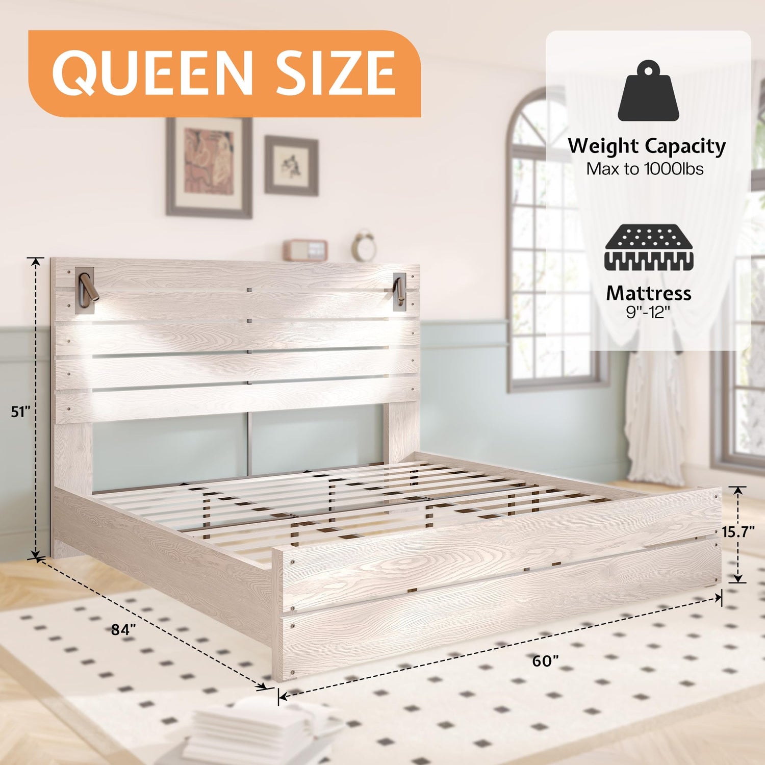 Jocisland Queen Size Farmhouse Bed Frame with 51" Headboard, LED Reading Lights, Rustic Wood Look, No Box Spring Needed, Ash White