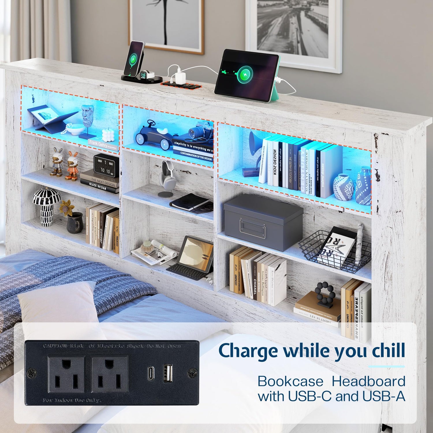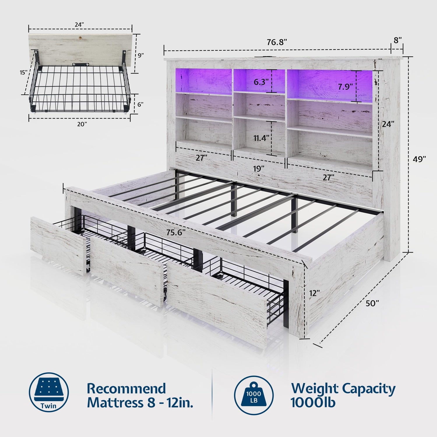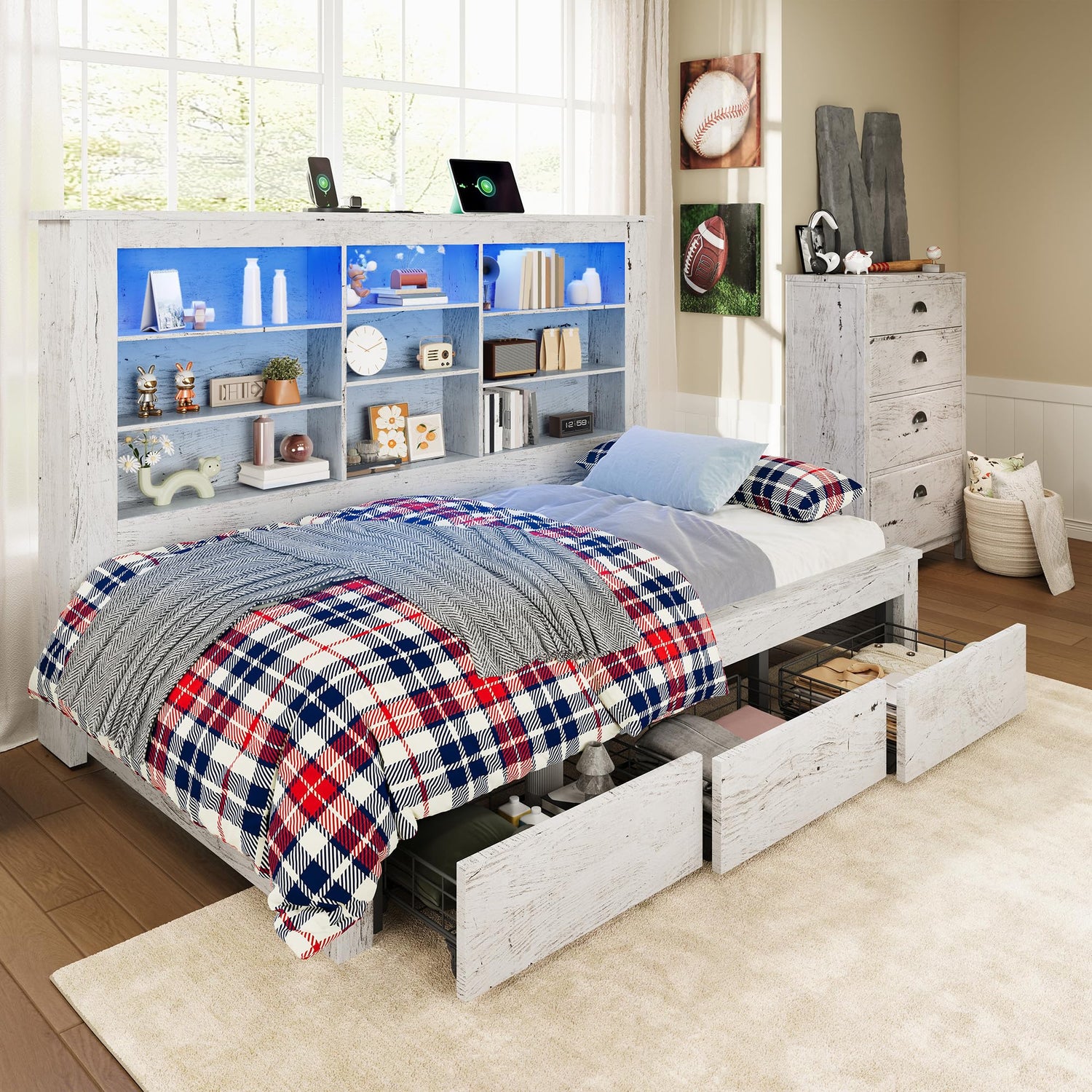 Jocisland Twin Daybed with Bookcase Headboard, USB-C Charging, RGB Lights & 3 Drawers, No Box Spring Needed, Farmhouse Wood Bed Frame for Teens, Dorms, Guest Room, Distressed White