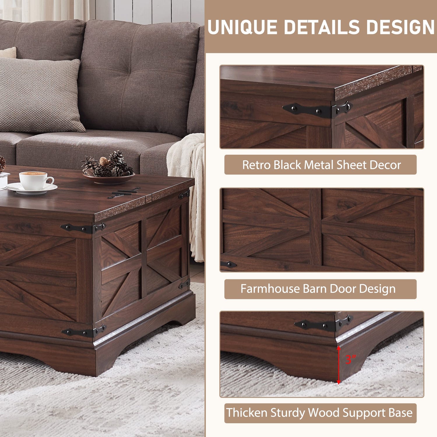 • LARGE HIDDEN STORAGE SPACE: Make your living room more big and tidy with our farmhouse coffee table. Both side tabletops can be lifted up to reveal spacious compartments(30*30*13.4 in), ideal for storing pillows, blankets, board games, and baby toys while keeping them away from dust and maintaining a clean and tidy living room. Product Measured: 31.5 "x31.5 "x18", unique square shape, just the right size, not only can match your sofa well but also can be well adapted to small and large spaces.