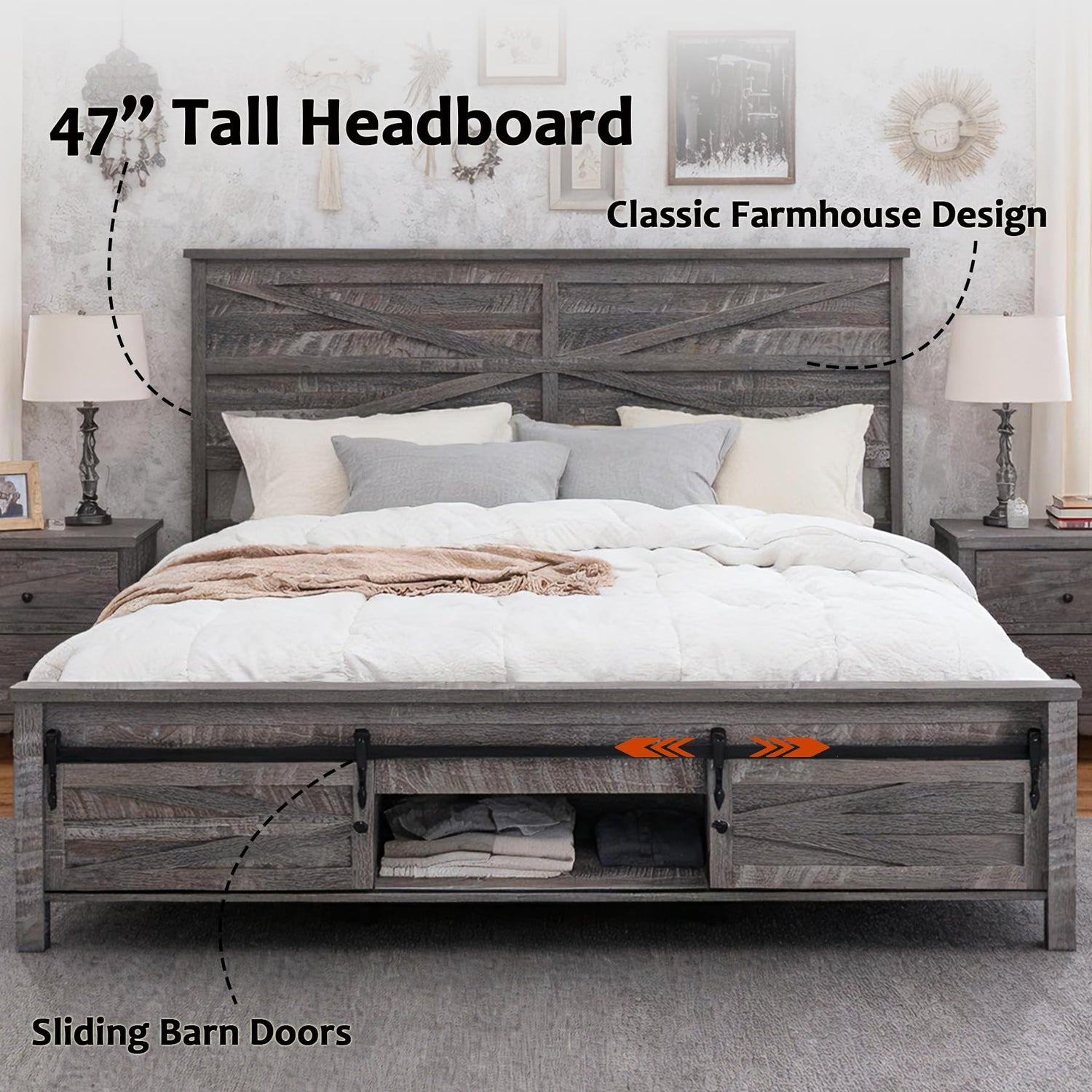 JXQTLINGMU Farmhouse King Size Bed Frame with 47" Tall Headboard, Wood King Bed Frame with Storage Cabinet, Solid Wood Slats Support, Noiseless, No Box Spring Needed (Grey)
