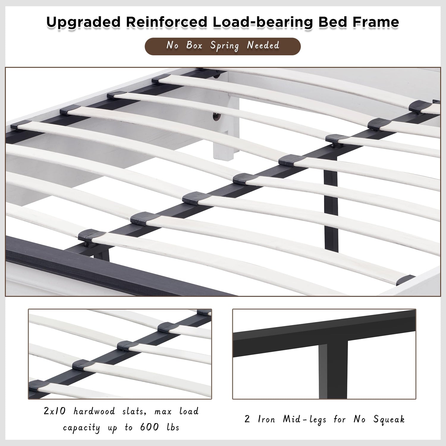 • 600 LBS Weight Capacity, Quiet & Sturdy: Built with heavy-duty bolt-on rails and a center support slat system, this wood queen bed frame offers stability with a maximum weight capacity of 600 lbs. Twenty premium wooden slats evenly distribute weight, while a sturdy steel frame and two inner legs provide extra support. Enjoy a peaceful, squeak-free sleep without the need for a box spring. Recommended mattress thickness: 8-12 inches