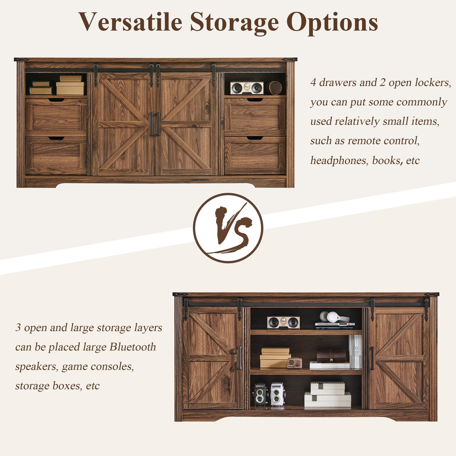 - Farmhouse Style: Our TV console showcases 2 distinctive barn doors, and behind the barn door are four semi-hidden drawers,Imitation wood grain stickers in different colors and styles enrich the character, Elevate your living space with the rustic elegance of our Farmhouse-Style TV Console
