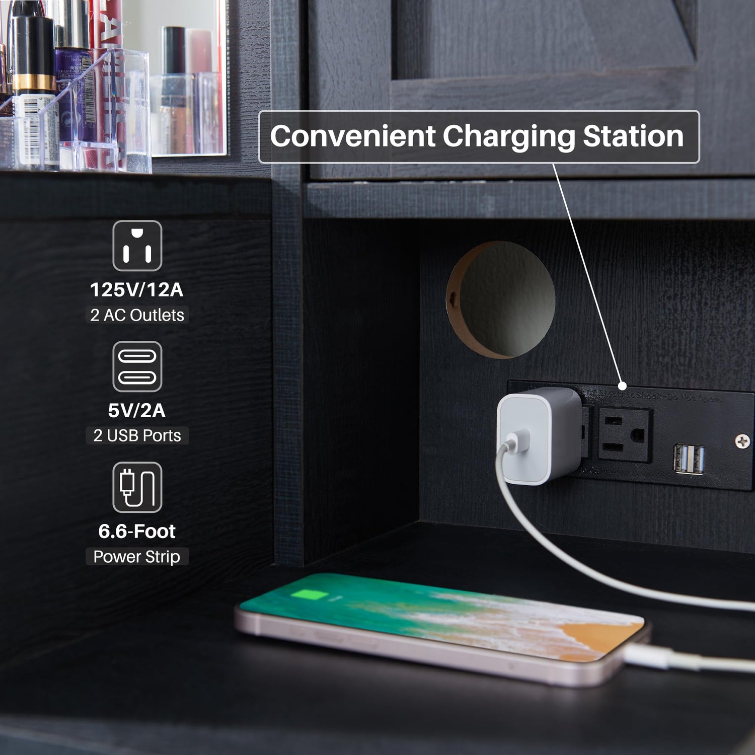 - 【Convenient Charging Station】Outfitted with a built-in power strip, 2 standard AC outlets and 2 USB ports are ready to provide great convenience for you to use hair straightener or blow dryer. Without moving your position, you coud finish your exquisite makeup and hair styling sitting on the soft vanity stool in set of this vanity desk